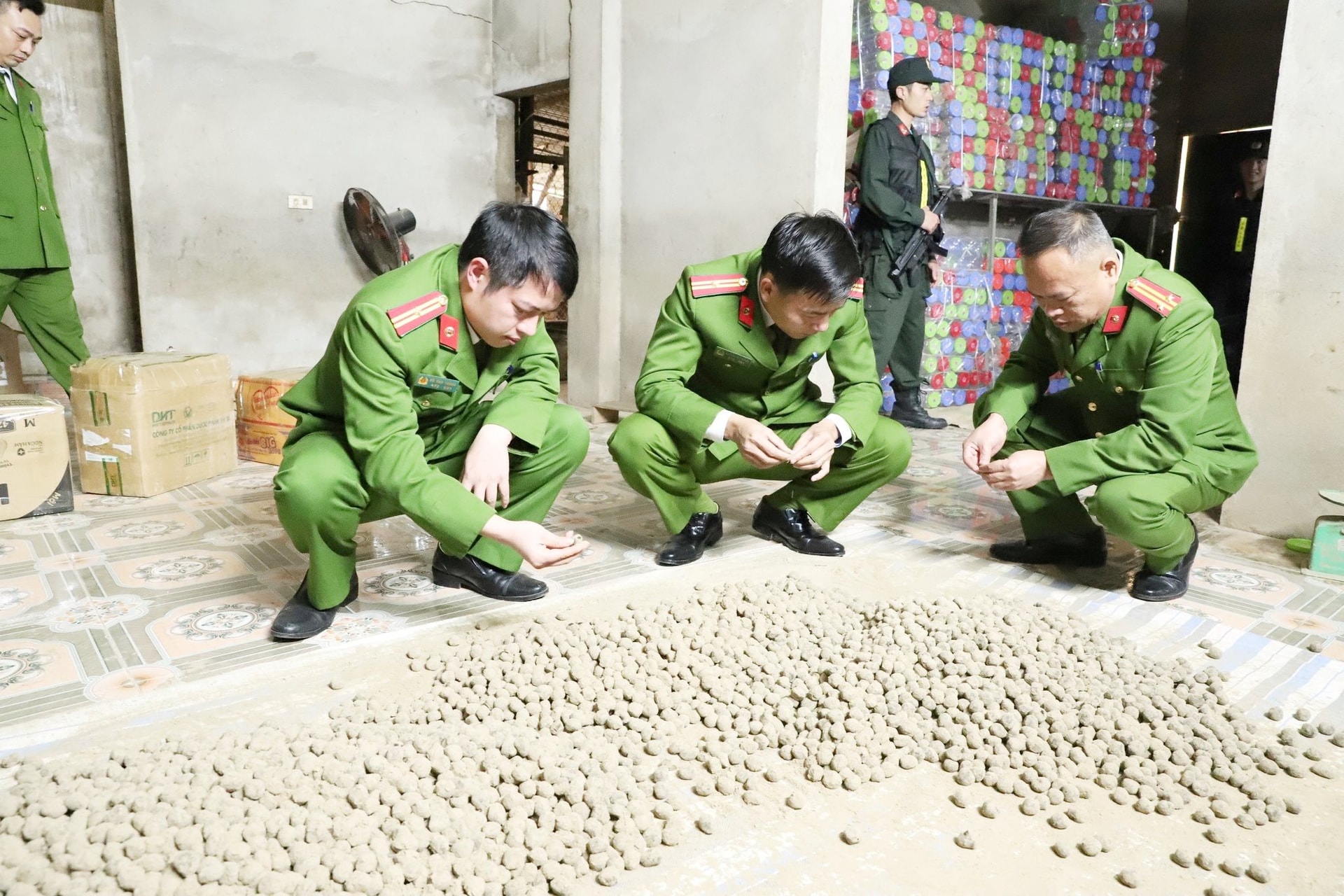 Tại hiện trường, lực lượng chức năng phát hiện thu giữ hơn 1 tấn thuốc thành phẩm dạng viên hoàn, hàng trăm nghìn viên tân dược cùng hơn 1 tấn nguyên liệu thô gồm mật mía, bột ngô và máy móc đóng gói hiện đại.