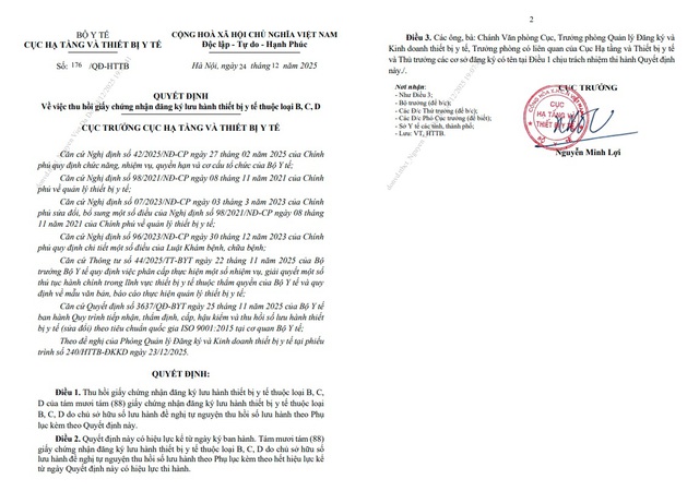Theo Quyết định số 176 ngày 24/12/2025 (Quyết định 176) của Cục Hạ tầng và Thiết bị Y tế về việc thu hồi giấy chứng nhận đăng ký lưu thành thiết bị y tế thuộc loại B,C,D, các sản phẩm nằm trong danh sách thu hồi do nhiều doanh nghiệp có tiếng đứng tên. Công ty TNHH Medtronic Việt Nam chiếm 49/88 sản phẩm thu hồi giấy chứng nhận.