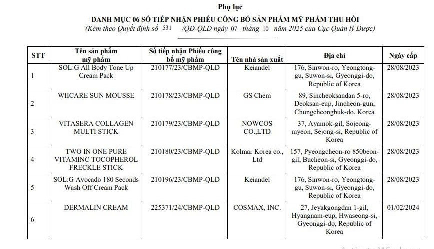 Cục Quản lý Dược (Bộ Y tế) vừa ban hành Quyết định số 531/QĐ-QLD ngày 7/10/2025 về việc thu hồi 6 số tiếp nhận Phiếu công bố sản phẩm mỹ phẩm với các sản phẩm gồm: