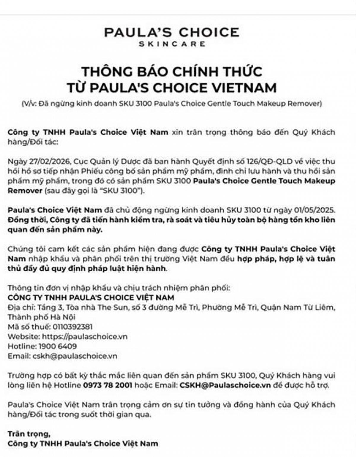Paula's Choice Việt Nam cũng phát đi thông báo