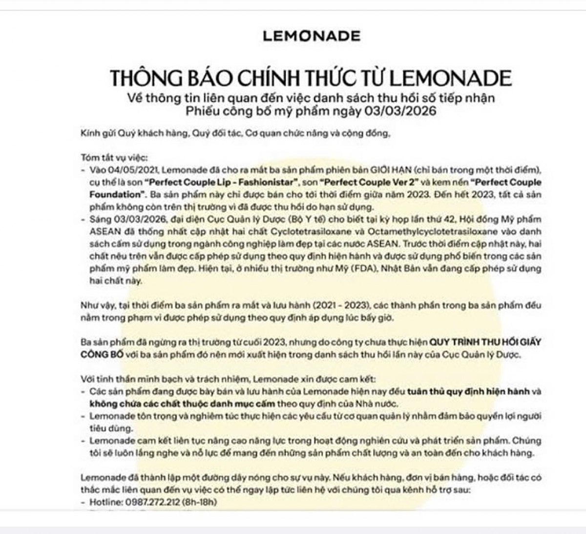 Tương tự, Paula's Choice Việt Nam thông báo sản phẩm nằm trong danh sách đã ngừng kinh doanh từ tháng 5/2025, trong khi Lemonade lý giải các mặt hàng bị gọi tên là phiên bản giới hạn đã dừng bán từ lâu và việc xuất hiện trong quyết định thu hồi chỉ liên quan đến thủ tục hành chính chưa hoàn tất. Dù các nhãn hàng đều đưa ra lý do đã xử lý nội bộ, nhưng dưới góc nhìn của người tiêu dùng, một câu hỏi hóc búa vẫn còn bỏ ngỏ là nếu đã ngừng bán, tại sao thông tin này không được truyền thông rộng rãi tới khách hàng từ trước đó? 3 thương hiệu có tên trong danh sách gồm MERZY, Paula's Choice Việt Nam và Lemonade đã phát đi thông báo chính thức.