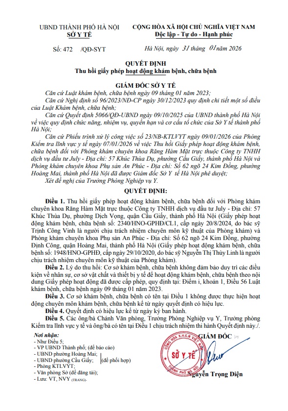 Theo đó, Sở Y tế Hà Nội thu hồi giấy phép hoạt động khám bệnh, chữa bệnh đối với Phòng khám chuyên khoa Răng Hàm Mặt trực thuộc Công ty TNHH Dịch vụ Đầu tư July - địa chỉ: 57 Khúc Thùa Dụ, phường Dịch Vọng, quận Cầu Giấy, thành phố Hà Nội (Giấy phép hoạt động khám bệnh, chữa bệnh số: 2340/HNO-GPHĐ/CL1, cấp ngày 20/8/2024, do bác sỹ Trịnh Công Vinh là người chịu trách nhiệm chuyên môn kỹ thuật của Phòng khám).