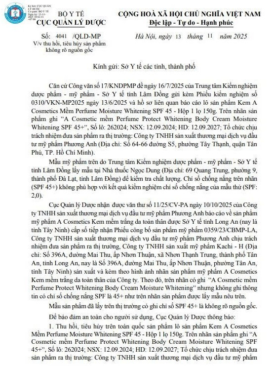 Ngày 13/11/2025, Cục Quản lý Dược ban hành Công văn số 4041/QLD-MP về việc thu hồi, tiêu hủy sản phẩm không rõ nguồn gốc (Kem A Cosmetics Mềm Perfume Moisture Whitening SPF 45 - Hộp 1 lọ 150g).