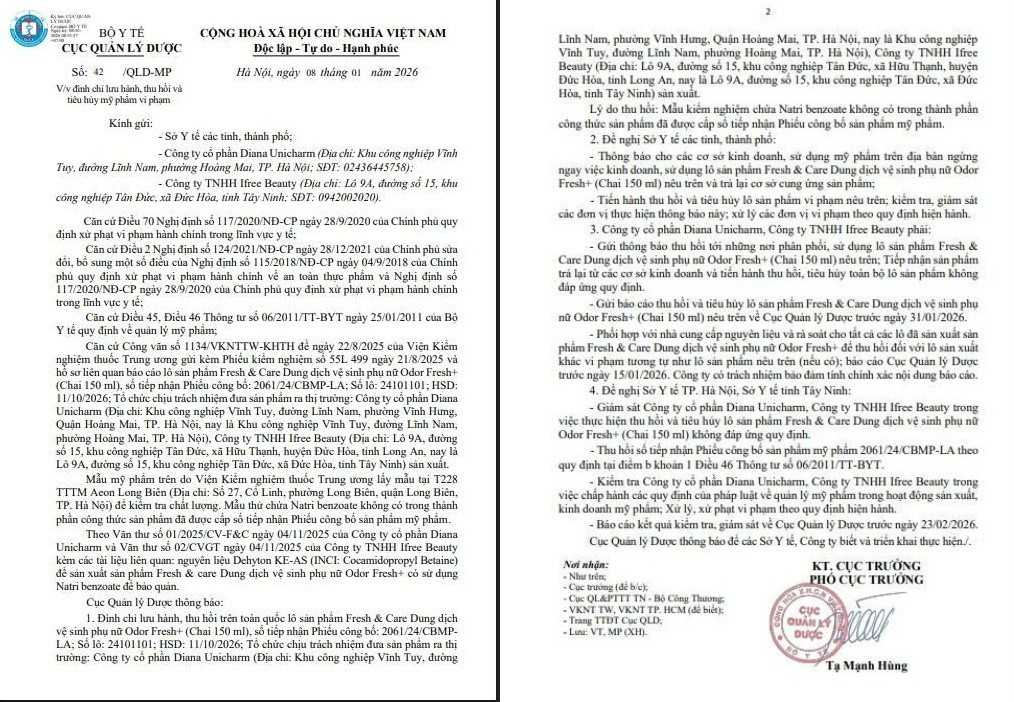 Cụ thể, Cục Quản lý Dược đình chỉ lưu hành, thu hồi trên toàn quốc lô sản phẩm Fresh & Care Dung dịch vệ sinh phụ nữ Odor Fresh+ (Chai 150 ml). Sản phẩm có số tiếp nhận Phiếu công bố 2061/24/CBMP LA, số lô 24101101, HSD 11/10/2026. Tổ chức chịu trách nhiệm đưa sản phẩm ra thị trường là Công ty Cổ phần Diana Unicharm (địa chỉ: Khu công nghiệp Vĩnh Tuy, đường 2 Lĩnh Nam, phường Vĩnh Hưng, Quận Hoàng Mai, TP Hà Nội, nay là Khu công nghiệp Vĩnh Tuy, đường Lĩnh Nam, phường Hoàng Mai, TP Hà Nội). Công ty TNHH Ifree Beauty (địa chỉ: Lô 9A, đường số 15, khu công nghiệp Tân Đức, xã Hữu Thạnh, huyện Đức Hòa, tỉnh Long An, nay là Lô 9A, đường số 15, khu công nghiệp Tân Đức, xã Đức Hòa, tỉnh Tây Ninh) sản xuất.