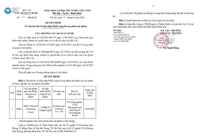 Theo Quyết định về việc thu hồi phiếu tiếp nhận công bố sản phẩm mỹ phẩm của Cục Quản lý Dược - Bộ Y tế, mỹ phẩm bị thu hồi có tên Dabo. Tên sản phẩm ghi trên Phiếu công bố mỹ phẩm là Dabo Charcoal Cleansing Foam.