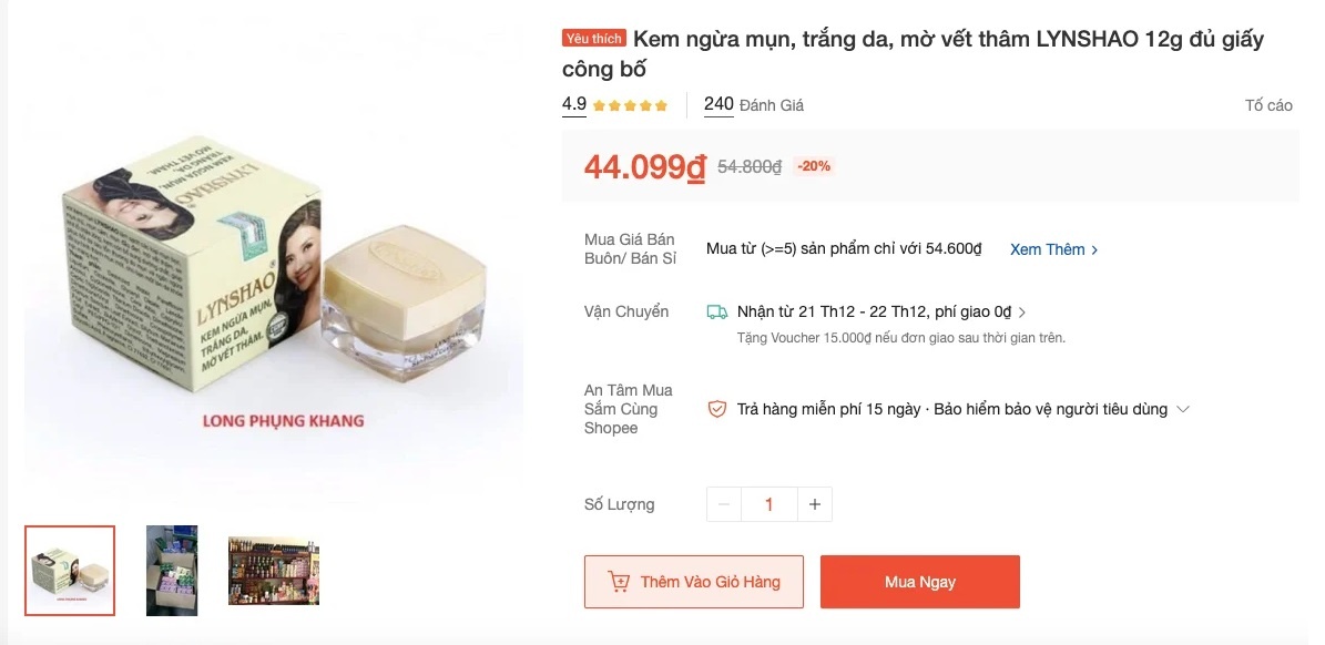 Cục Quản lý Dược (Bộ Y tế) vừa ban hành thông báo đình chỉ lưu hành, thu hồi, tiêu hủy trên toàn quốc lô sản phẩm Kem trắng da, ngừa mụn, mờ vết thâm LYNSHAO (hộp 1 lọ 12 g) do vi phạm quy định về quản lý mỹ phẩm.