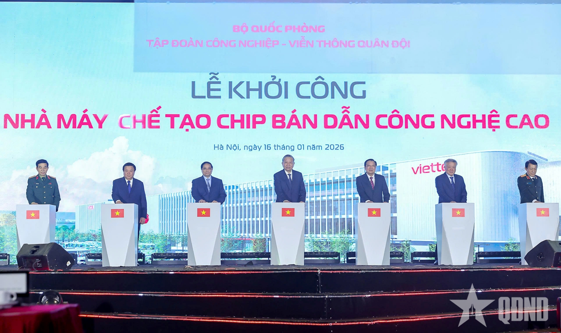 Lãnh đạo Đảng, Nhà nước, Quân đội thực hiện nghi thức khởi công Nhà máy chế tạo chip bán dẫn công nghệ cao của Tập đoàn Công nghiệp-Viễn thông Quân đội (Viettel). Ảnh: TRỌNG HẢI