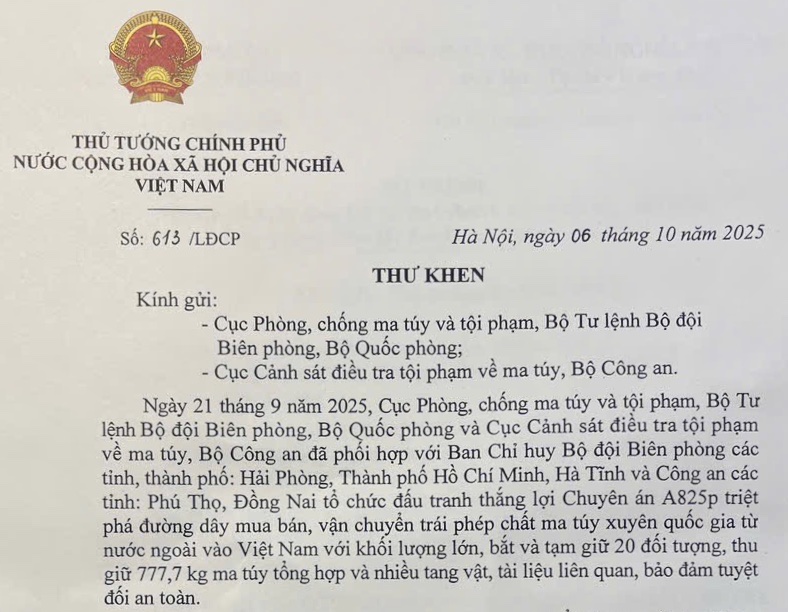 Trước đó, ngày 21/9/2025, Cục Phòng, chống ma túy và tội phạm, Bộ Tư lệnh Bộ đội Biên phòng, Bộ Quốc phòng và Cục Cảnh sát điều tra tội phạm về ma túy, Bộ Công an đã phối hợp với Ban Chỉ huy Bộ đội Biên phòng các tỉnh, thành phố: Hải Phòng, Thành phố Hồ Chí Minh, Hà Tĩnh và Công an các tỉnh: Phú Thọ, Đồng Nai tổ chức đấu tranh thắng lợi Chuyên án A825p triệt phá đường dây mua bán, vận chuyển trái phép chất ma túy xuyên quốc gia từ nước ngoài vào Việt Nam với khối lượng lớn, bắt và tạm giữ 20 đối tượng, thu giữ 777,7 kg ma túy tổng hợp và nhiều tang vật, tài liệu liên quan, bảo đảm tuyệt đối an toàn.