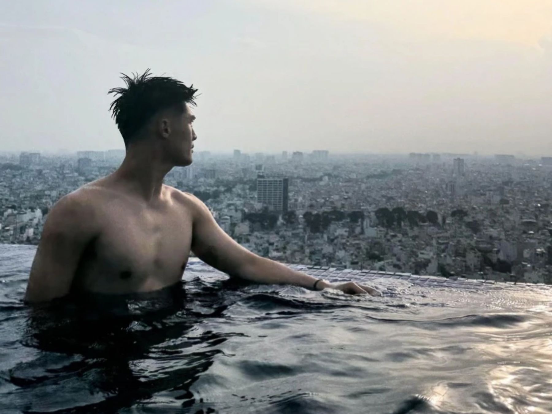 Ngoài sân cỏ, Trung Kiên còn đặc biệt yêu thích bơi lội. Trong những chuyến du lịch, anh thỉnh thoảng ghi lại khoảnh khắc thả mình trên hồ bơi, ngắm hoàng hôn.