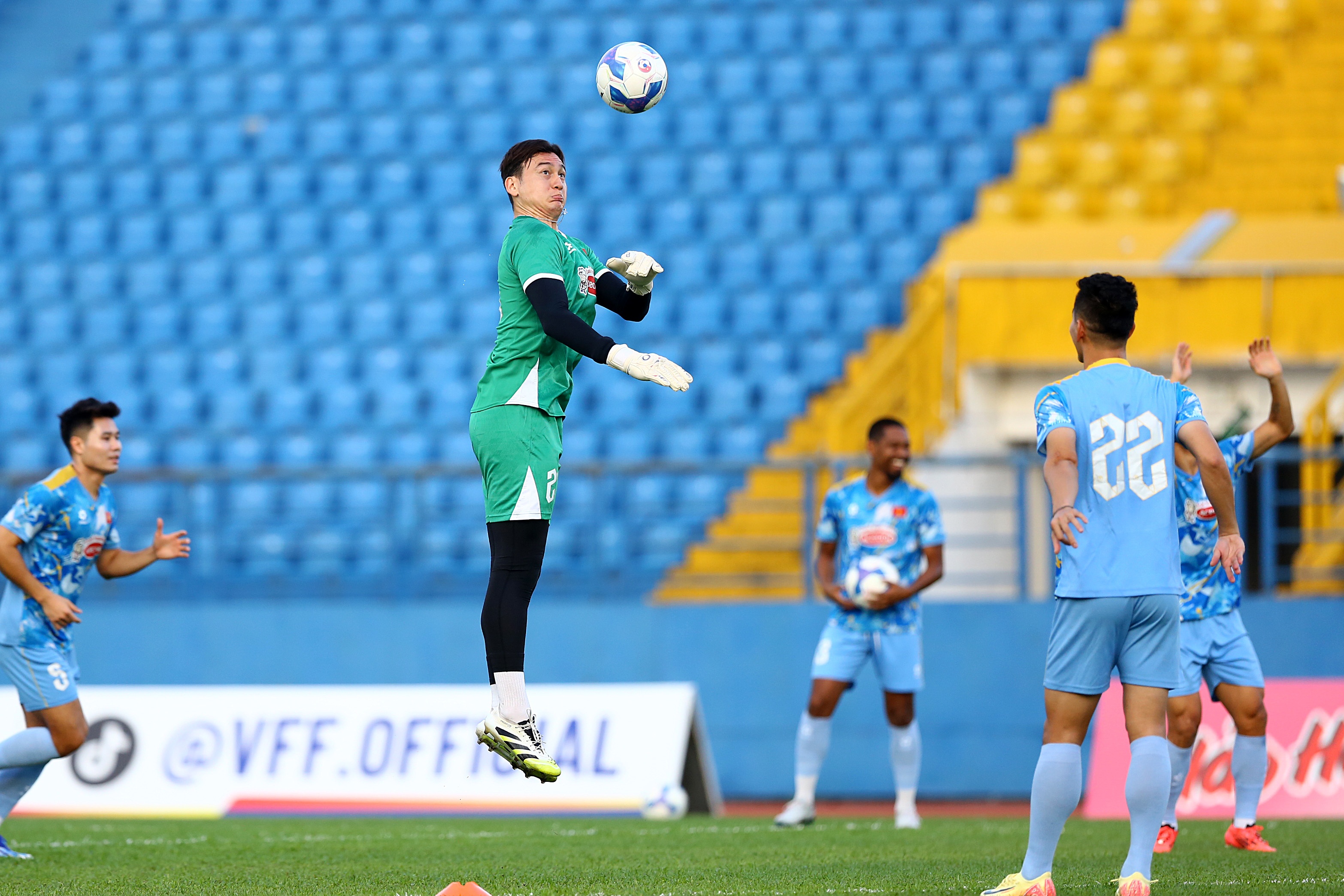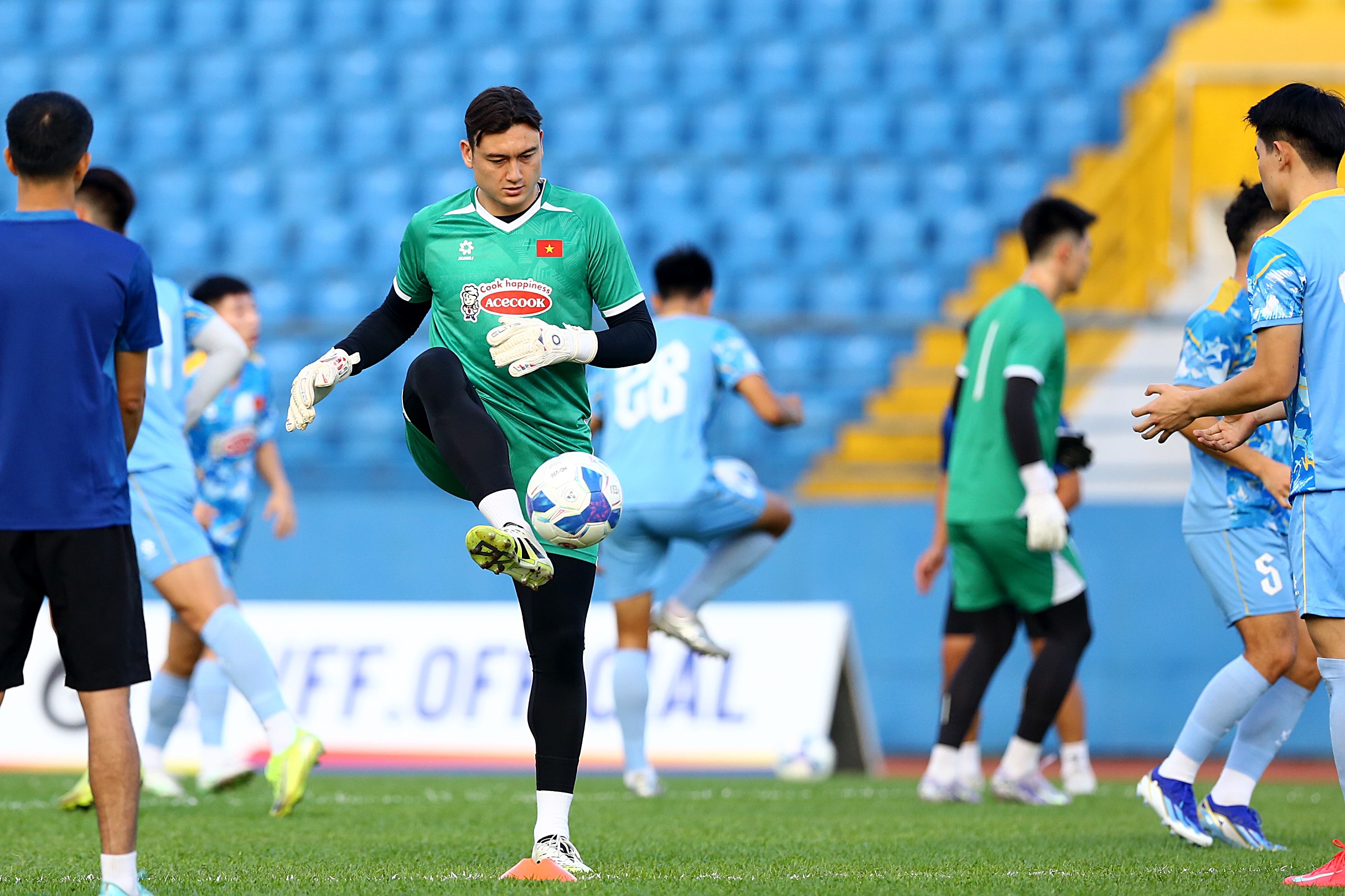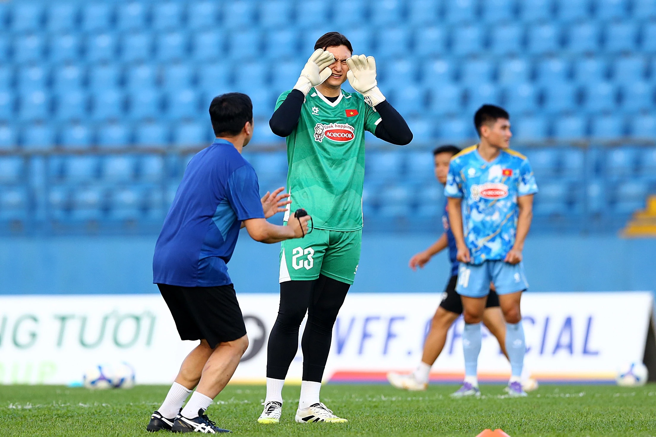 Đặng Văn Lâm (Ninh Bình) có phần bất ngờ khi được yêu cầu khởi động với bóng như các cầu thủ khác. Ban huấn luyện triển khai giáo án hướng đến việc giúp các thủ môn chủ động hơn trong khâu xử lý, phù hợp với xu hướng bóng đá hiện đại.