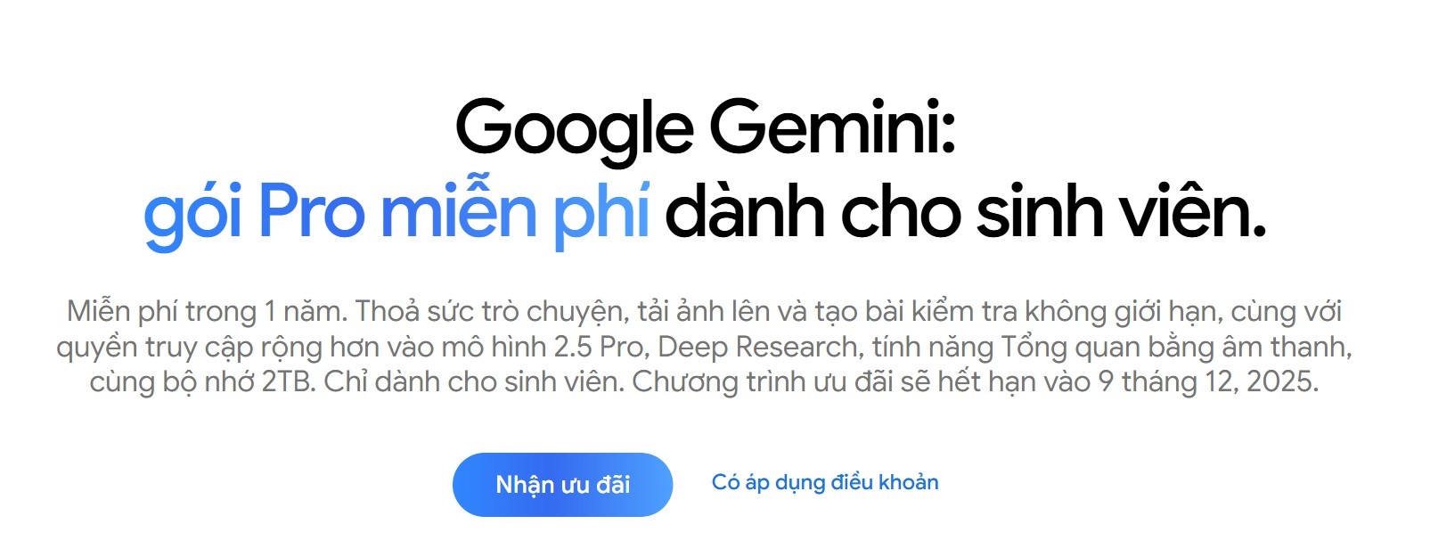 Thông báo tặng miễn phí một năm sử dụng gói Google AI Pro dành cho sinh viên đại học trên toàn quốc, với mục tiêu góp phần nâng cao chất lượng nguồn nhân lực tại Việt Nam. Ưu đãi này dành cho sinh viên từ 18 tuổi trở lên đang theo học tại các trường đại học, cao đẳng hoặc học viện trên toàn Việt Nam.