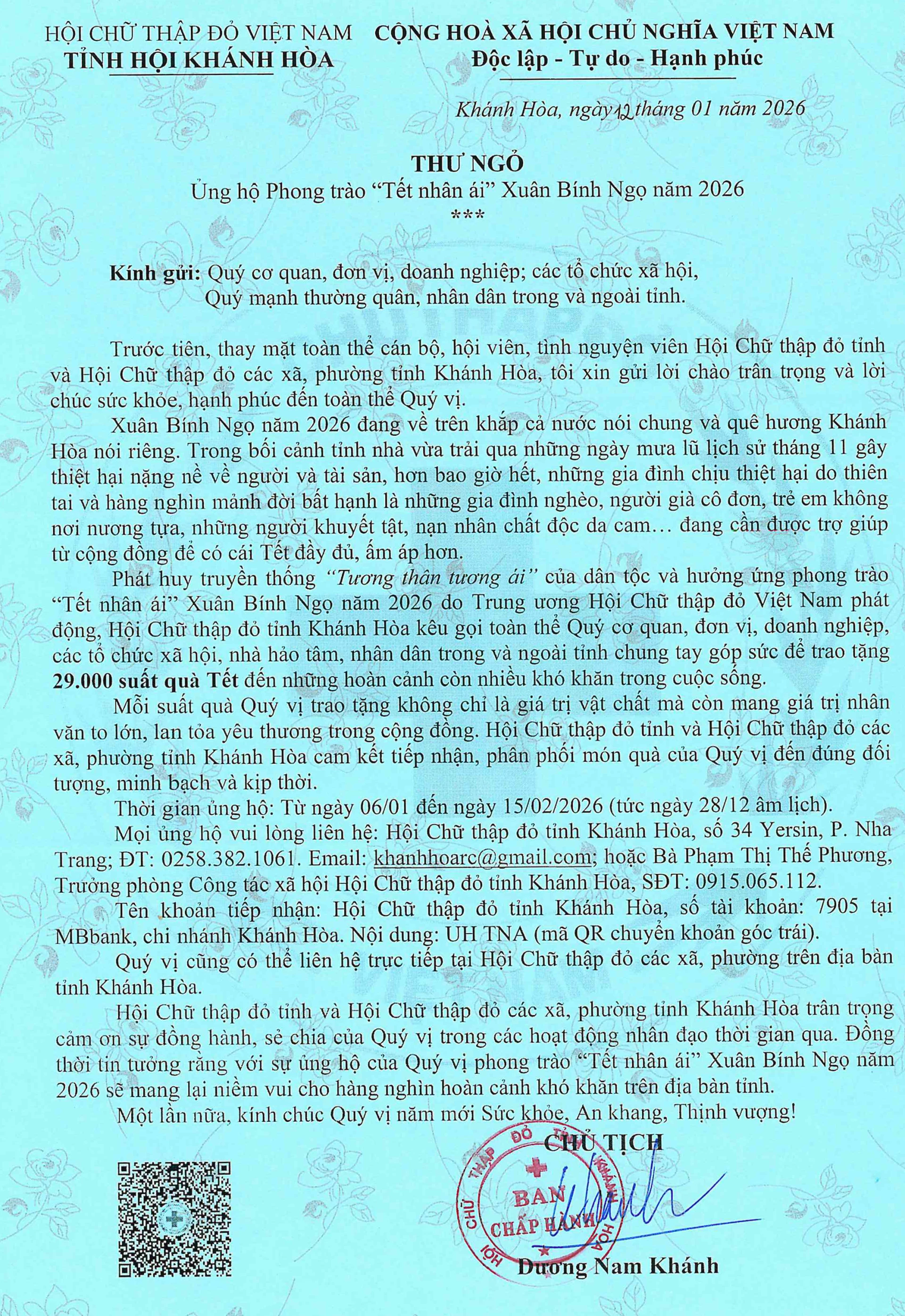 Dưới đây là Thư ngỏ của Hội Chữ thập đỏ tỉnh Khánh Hòa.