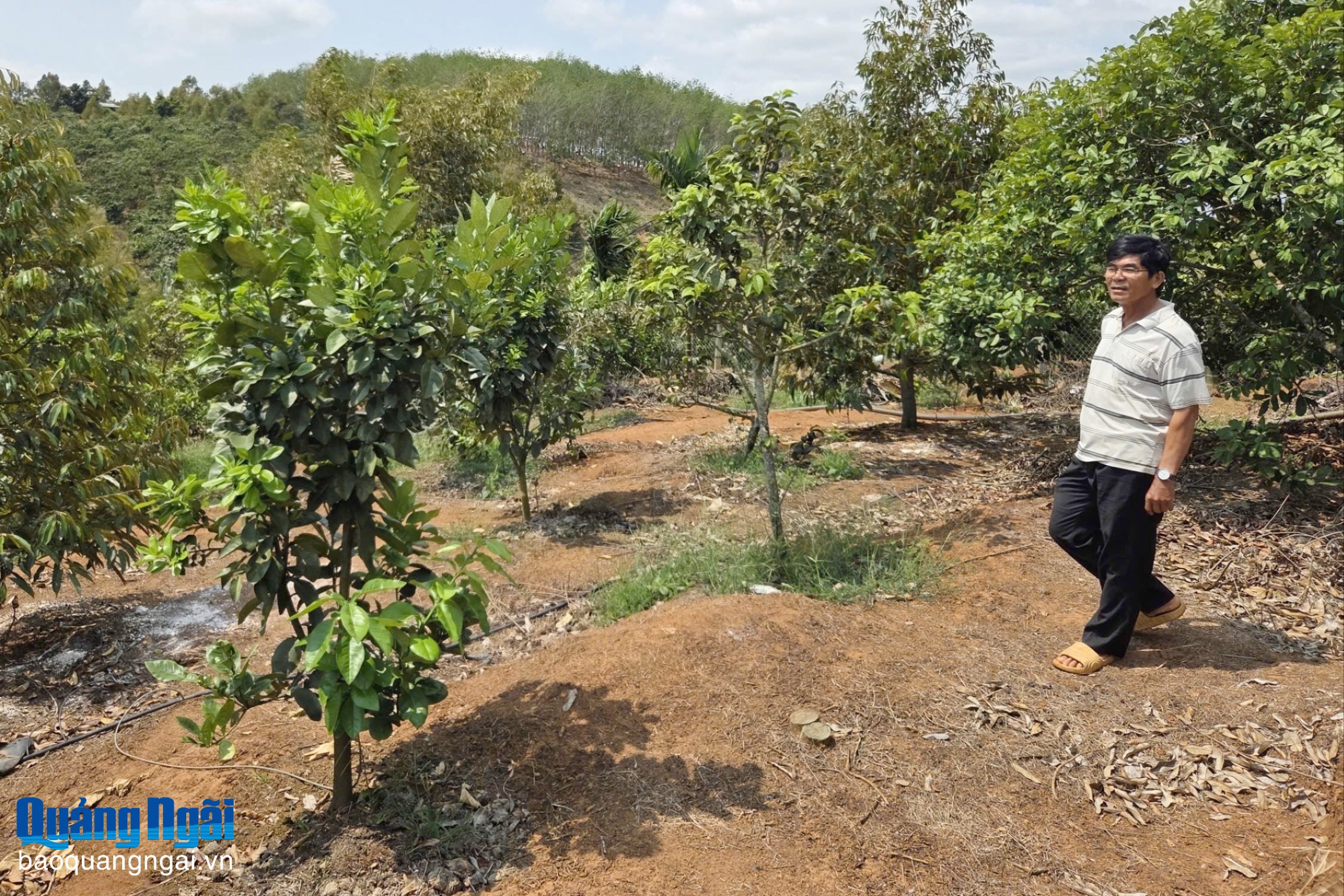 Ông Nguyễn Đăng Hai kiểm tra vườn cây của mình.
