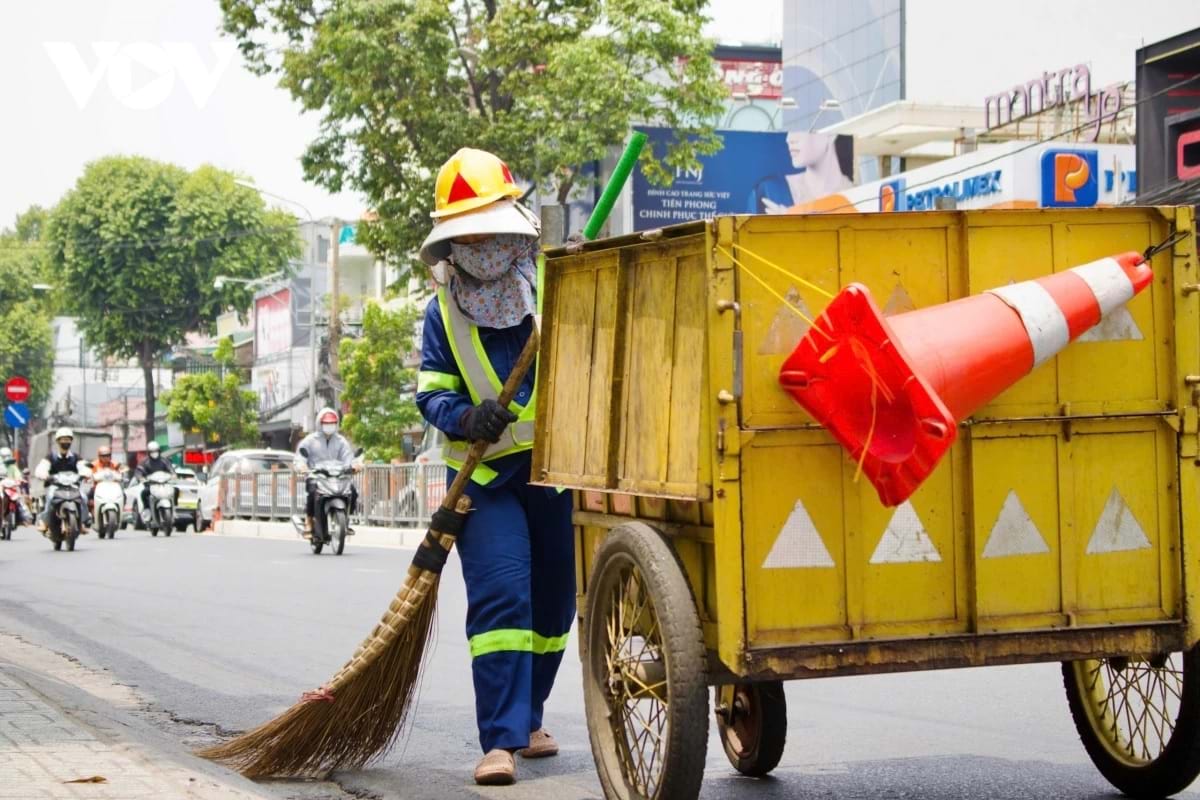 Nữ công nhân vệ sinh môi trường trùm kín người bằng khăn, bịt khẩu trang, đội mũ rộng vành và mang bao tay để chống chọi với tiết trời oi bức vì nắng và khói bụi. Ảnh: VOV
