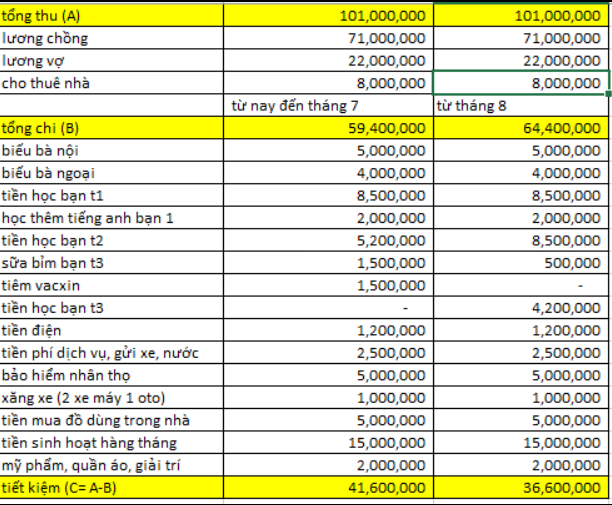 Theo bảng chi tiêu được chia sẻ, từ nay đến tháng 7, tổng thu của gia đình là 101 triệu đồng/tháng gồm lương chồng, lương vợ và tiền cho thuê nhà. Tổng chi khoảng 59,4 triệu đồng, chủ yếu cho biếu ông bà, học hành và sinh hoạt của ba con, bảo hiểm, xăng xe và chi tiêu gia đình. Mỗi tháng còn tiết kiệm khoảng 41,6 triệu đồng.