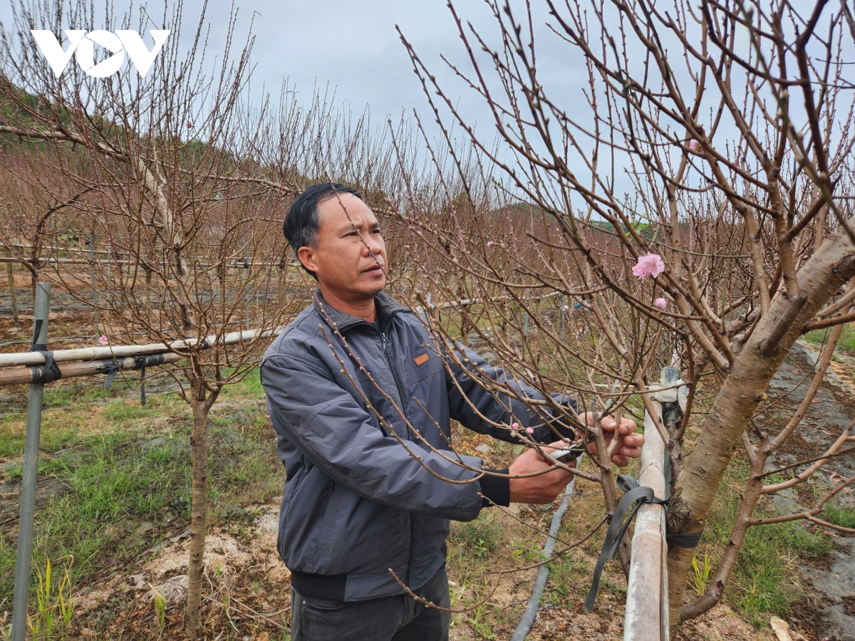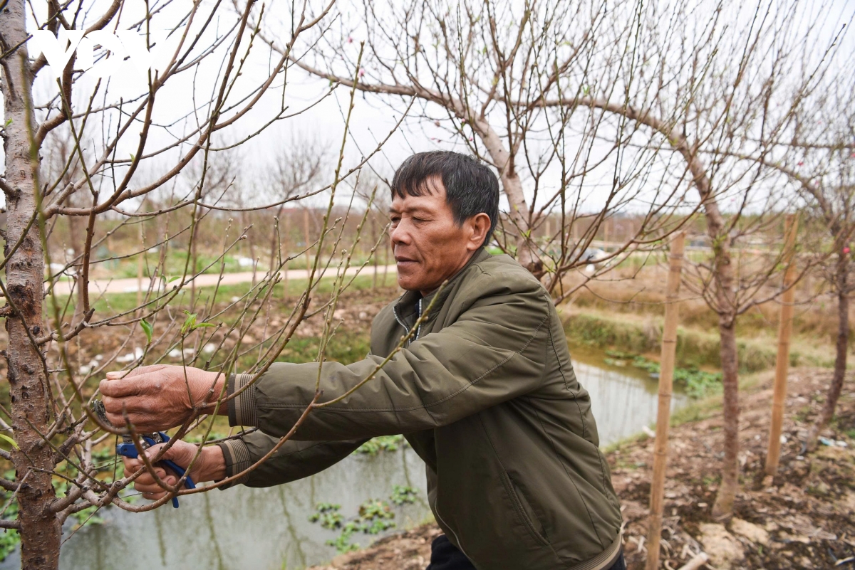 Ông Nguyễn Văn Tầng thôn Yên Thiện, xã Bảo Đài, tỉnh Bắc Ninh chăm sóc từng cây đào