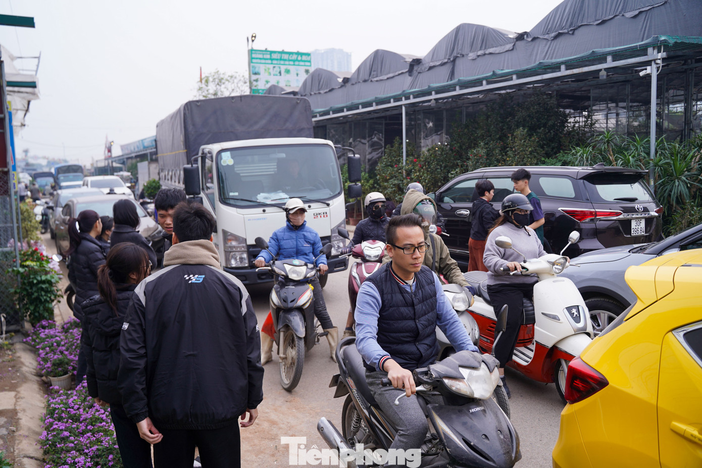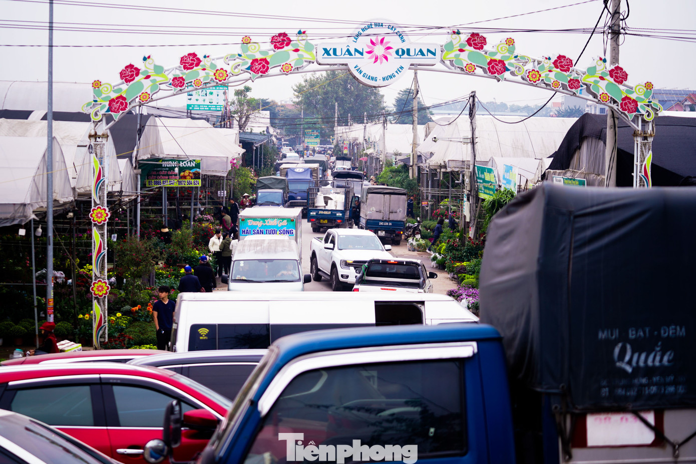 Lượng người và phương tiện đổ về dày đặc khiến tuyến đường vào làng hoa Xuân Quan nhiều thời điểm ùn tắc nhẹ.