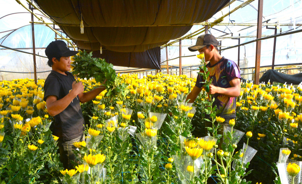 Ở các làng hoa, những tốp người làm công đến từ nhiều tỉnh miền Trung, miền Bắc miệt mài làm việc từ sáng sớm đến chiều tối. Chị Nguyễn Thị Thương, quê Hà Tĩnh, vừa thoăn thoắt tỉa cành vừa chia sẻ, năm nào cũng vậy, cứ khoảng tháng 10 âm lịch chị cùng vài người trong làng lại vào Đà Lạt làm hoa Tết. “Công cận Tết cao lắm, ai khỏe, làm nhanh, ăn theo sản phẩm thì mỗi ngày cũng được gần triệu bạc. Làm tới 28 Tết là tụi tôi bắt xe về quê, có đồng ra đồng vô, Tết đến cũng thấy vui hơn”. Nhiều loài hoa năm nay được mùa, cánh dày, màu tươi, thân thẳng, mang dáng vẻ tròn đầy báo hiệu một mùa xuân no đủ.