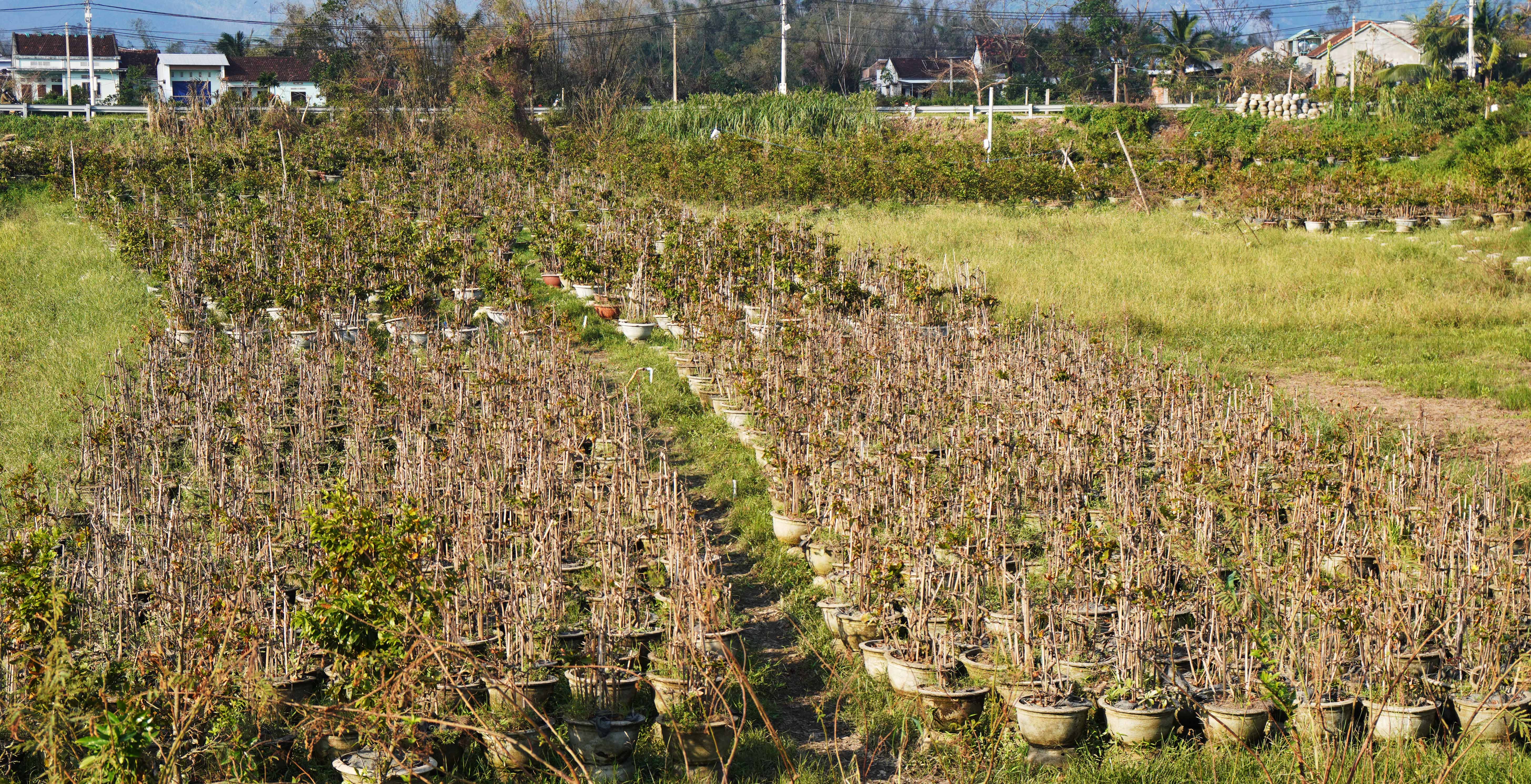Ở cánh đồng hoa mai Trung Lý (phường An Nhơn Bắc), bà Trần Thị Kim Hà (58 tuổi) dẫn chúng tôi đi giữa những vựa mai của gia đình đã bị gió bão đánh tơi tả. Hàng chục ngàn chậu mai bị “chà qua, xát lại”, lá rụng trụi, cành khô quắt như củi khô. Sau bão, trời nắng gắt khiến cây càng suy kiệt, nhiều cây chết dần.
