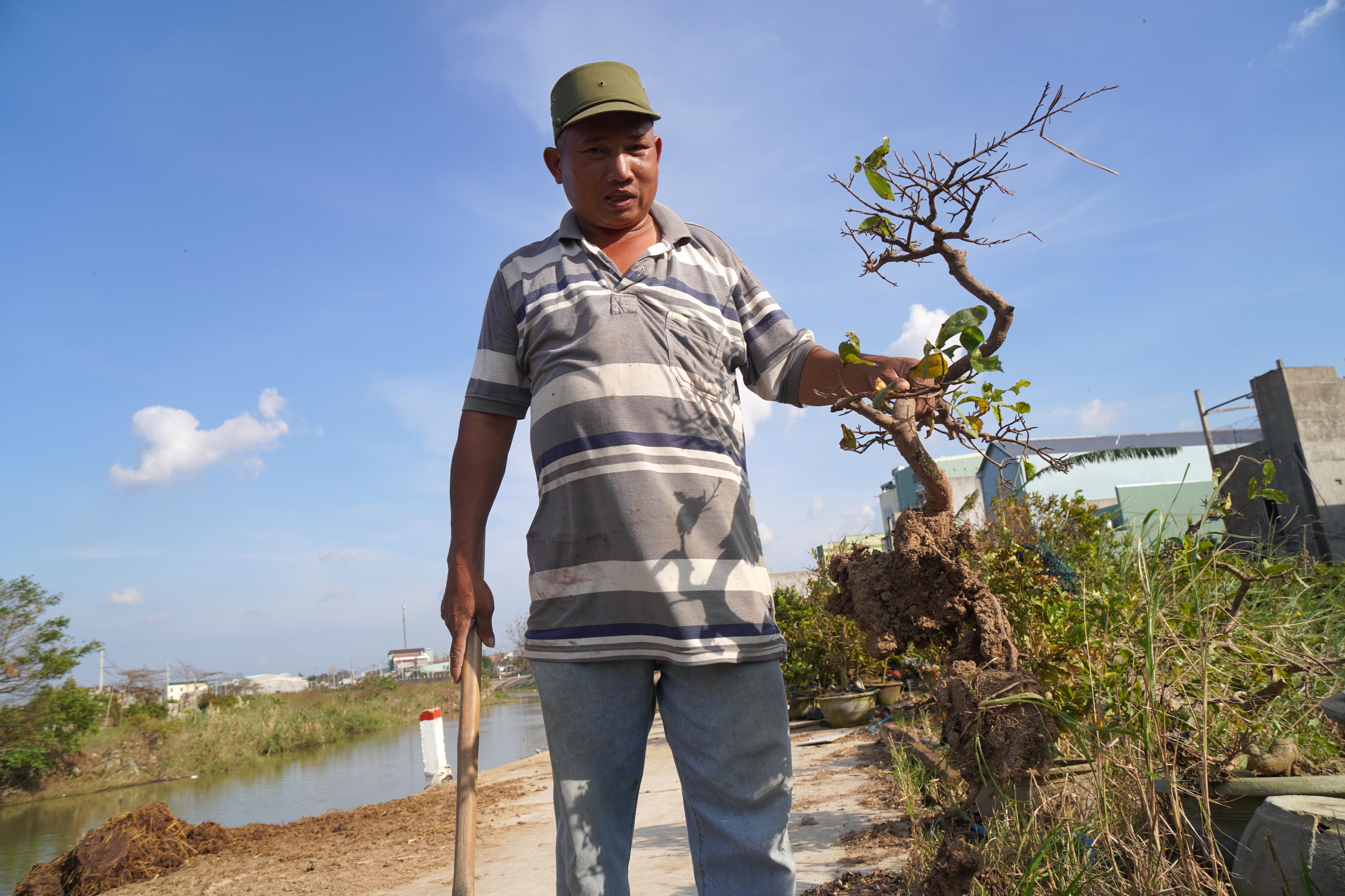 Bất lực nhìn cả vựa mai hàng ngàn chậu bị gió bão cuốn nát, dần cháy khô