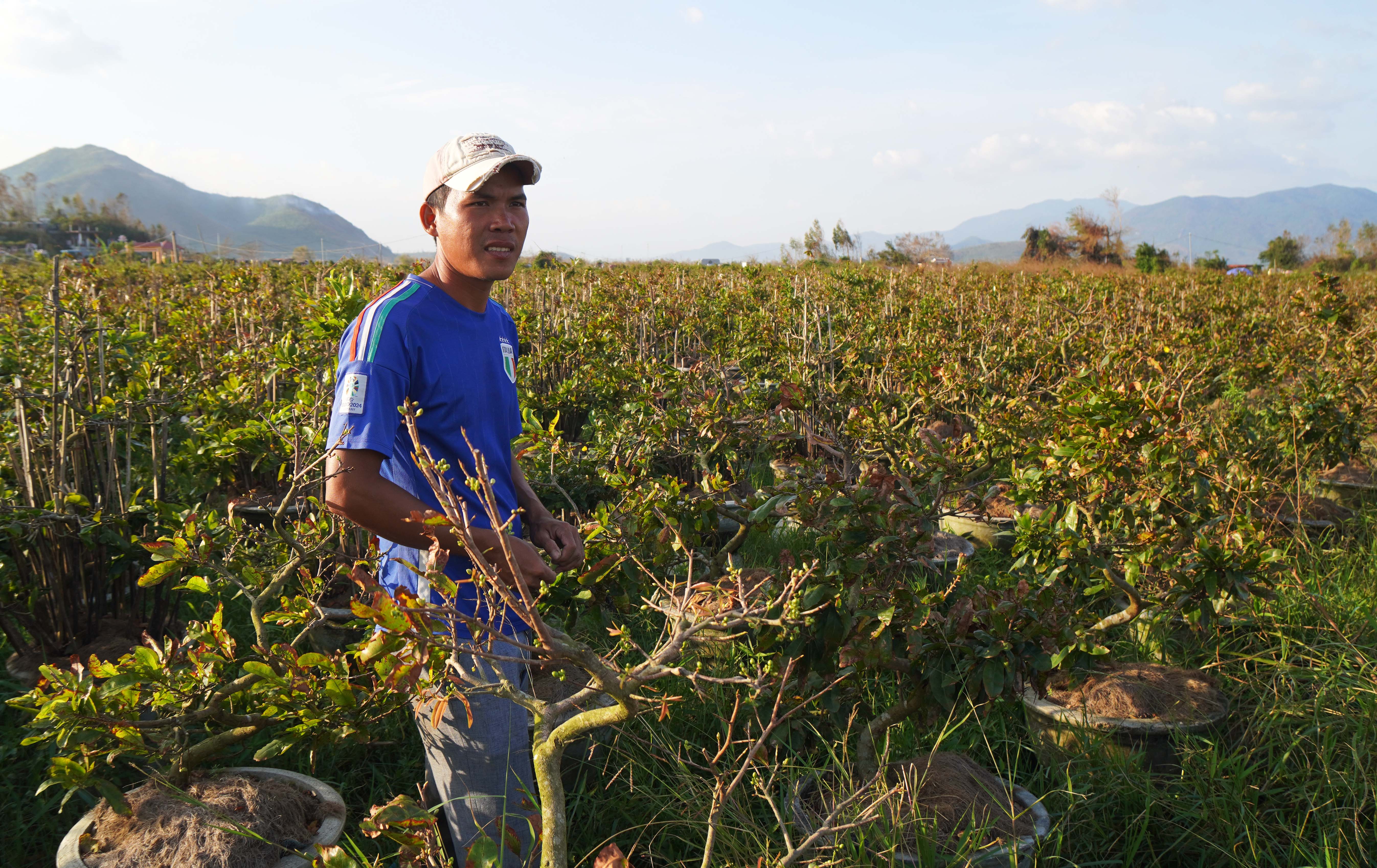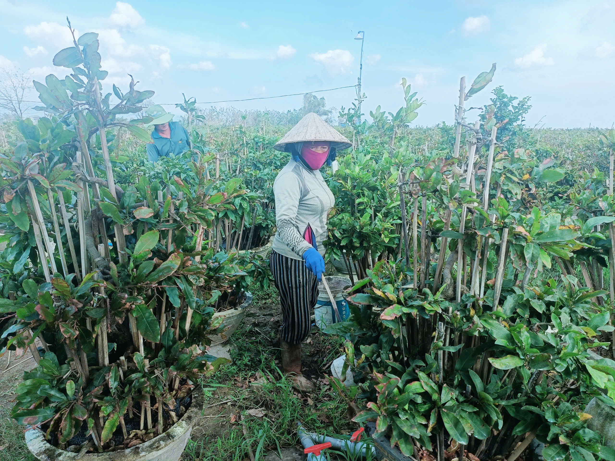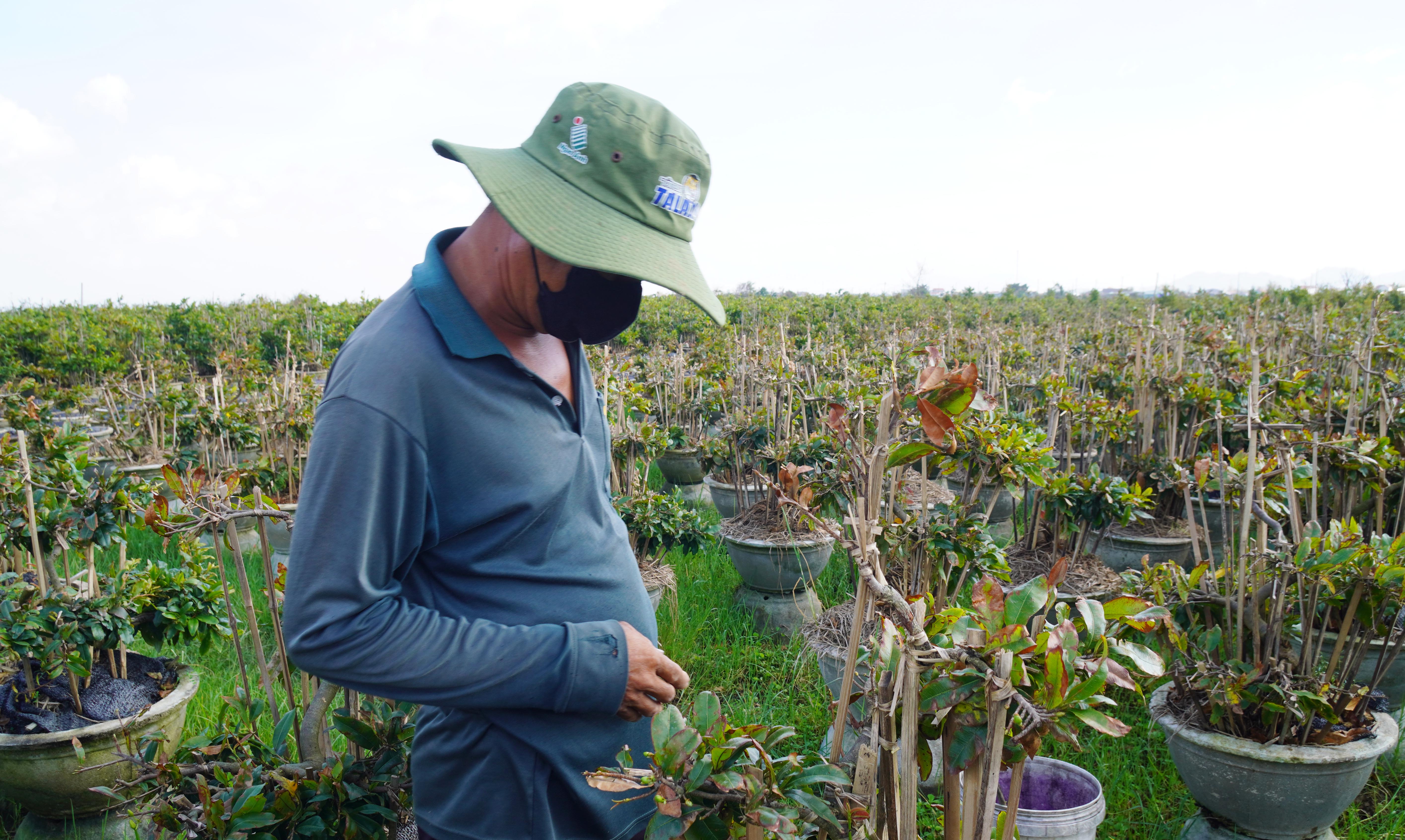 Ở phường An Nhơn Đông, nhiều hộ dù thiệt hại nặng vẫn nỗ lực khôi phục sản xuất. Vợ chồng ông Nguyễn Văn Bảy (thôn Thuận Thái) đang bón phân hữu cơ, dưỡng cây để cứu số mai bị gió bão chà xát.