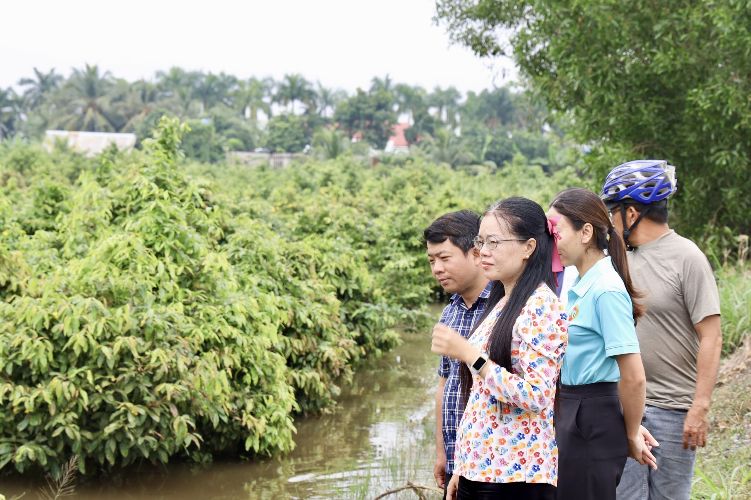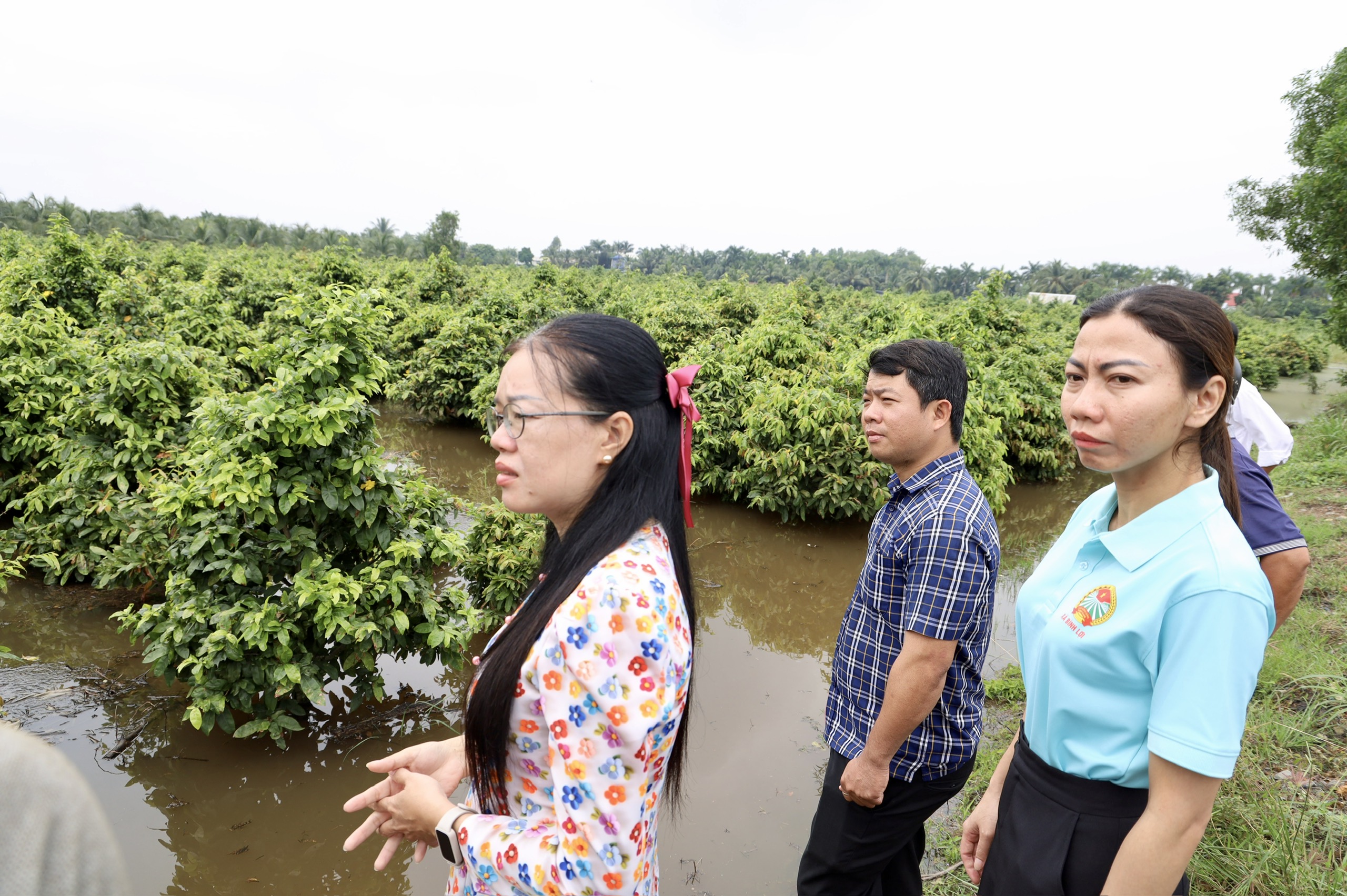 Ủy ban MTTQ Việt Nam xã Bình Lợi và Hội Nông dân xã khảo sát các vườn mai bị ngập nặng