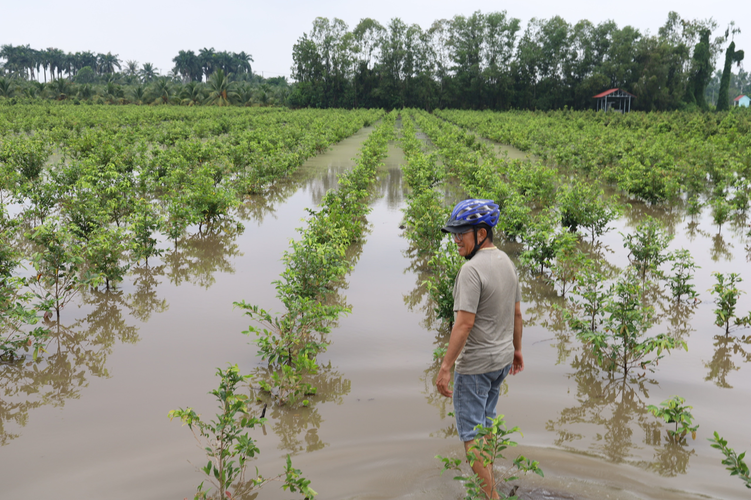 Nước dâng cao khiến 500 ha vườn mai chìm trong "biển nước", nhiều nơi ngập sâu từ 30 - 40 cm. Giữa những luống mai vốn thẳng tắp, giờ đây chỉ còn thấy mênh mông nước và những cây mai trơ trọi, lấp ló giữa làn sóng lăn tăn.
