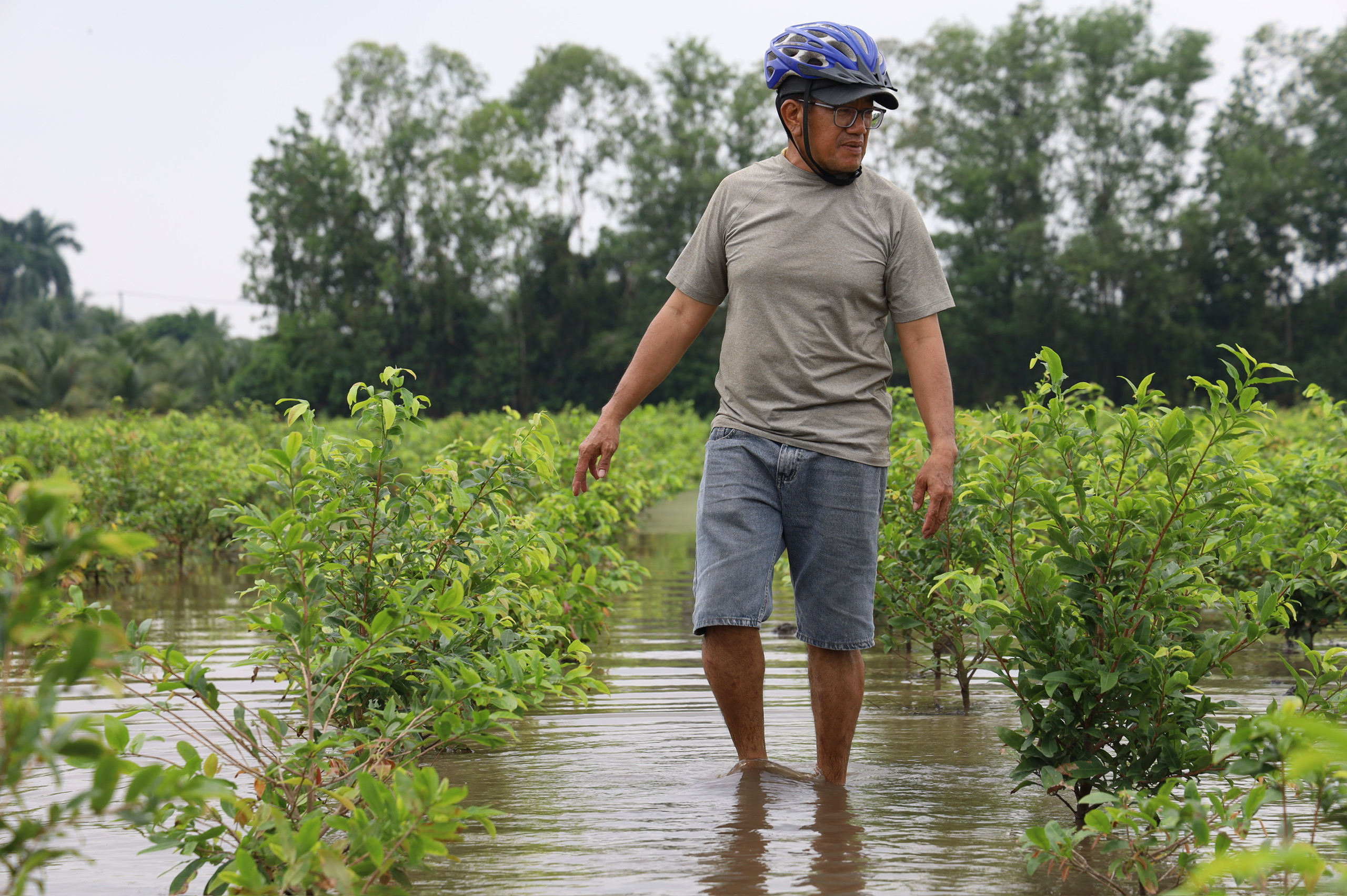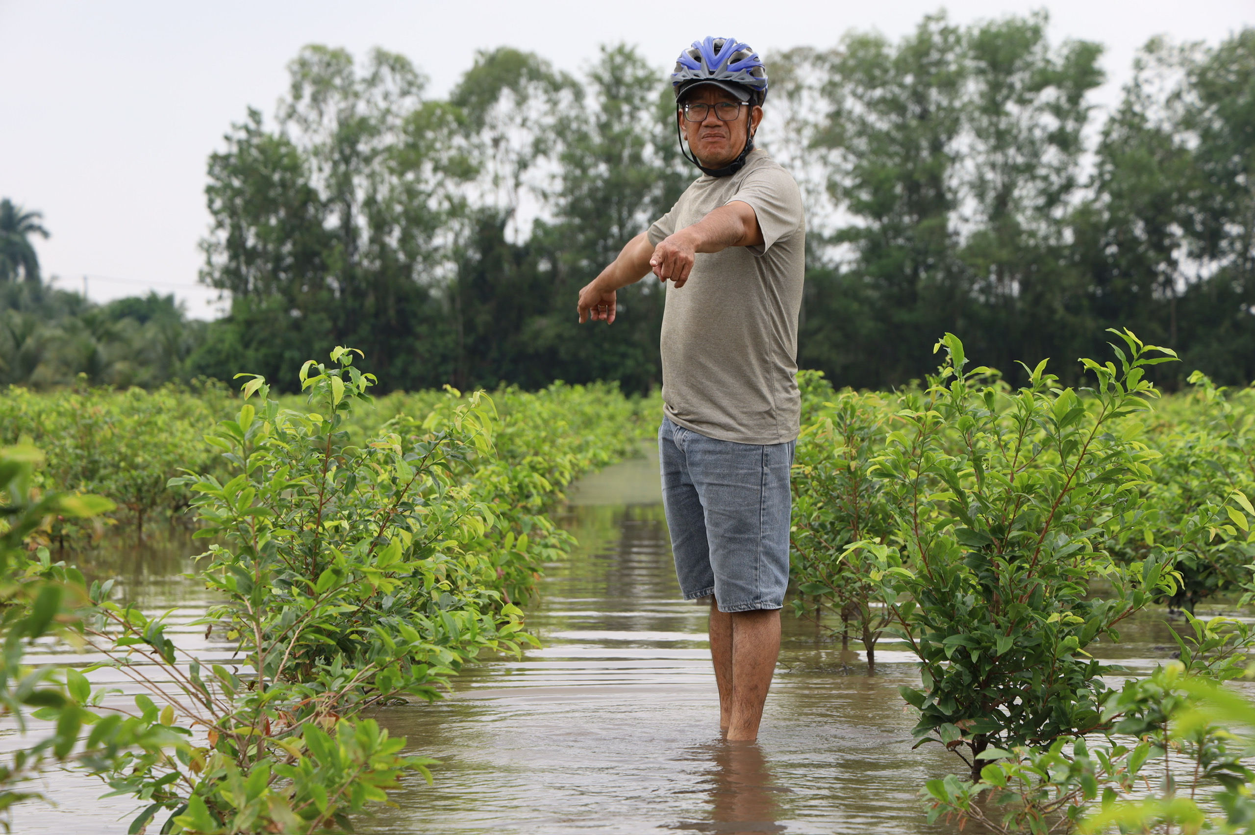Anh Nguyễn Trúc Linh, chủ vườn mai Nguyễn Linh, lo lắng cho biết nước bắt đầu dâng từ vài ngày trước và chưa có dấu hiệu rút. "Nếu tình trạng này kéo dài thêm, rễ cám sẽ bị thối trước, rồi lan dần đến bộ rễ gốc. Chỉ cần ngập 7 – 10 ngày là nguy cơ mất trắng cả vườn" - anh Linh ngao ngán. Dù đã mua máy bơm về xả nước, nhưng với lượng nước lớn như hiện nay, anh dự đoán phải mất hơn 10 ngày mới có thể bơm khô được toàn bộ vườn.
