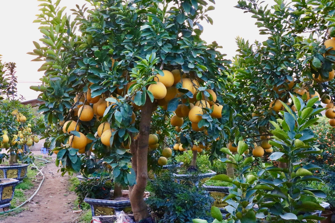 Theo ông Minh, để có một gốc bưởi đạt chuẩn, người trồng phải “nuôi quả” từ rất sớm, canh đúng thời điểm ra hoa, uốn tán, bấm ngọn cho cây phát triển cân đối. Một cây đẹp phải hội tụ đủ ba yếu tố: gốc khỏe, lá xanh dày và quả căng tròn, vàng bóng, kết hợp với chậu, bình trưng bày tinh xảo để nâng giá trị sản phẩm.