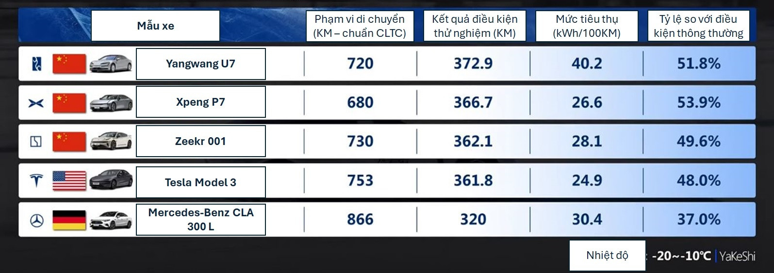 Cuộc thử nghiệm xe điện vào mùa đông quy mô lớn do Autohome - nền tảng truyền thông về ô tô lớn nhất Trung Quốc - tổ chức vừa công bố kết quả, cho thấy khoảng cách rất lớn giữa tầm hoạt động thực tế trong điều kiện giá lạnh và con số do nhà sản xuất công bố. Đây được xem là mục tiêu cốt lõi của bài thử nghiệm, trong bối cảnh xe điện ngày càng phổ biến tại những khu vực có khí hậu khắc nghiệt.