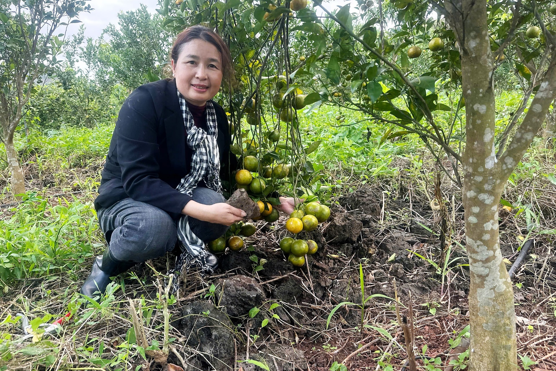 Chị Mai chia sẻ: “Trồng quýt trên đất núi lửa đòi hỏi cách làm riêng. Đất tơi xốp nhưng nhiều đá, nếu không xử lý tốt sẽ dễ thất thoát nước và dinh dưỡng”.