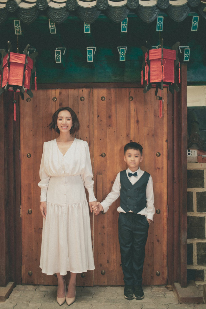 Trong loạt ảnh được đăng tải, Thu Trang xuất hiện bên con trai ở hai thời điểm khác nhau. Ở bức hình cũ, hai mẹ con diện trang phục trang nhã, đứng trước không gian mang màu sắc truyền thống, tạo cảm giác ấm áp, gần gũi.