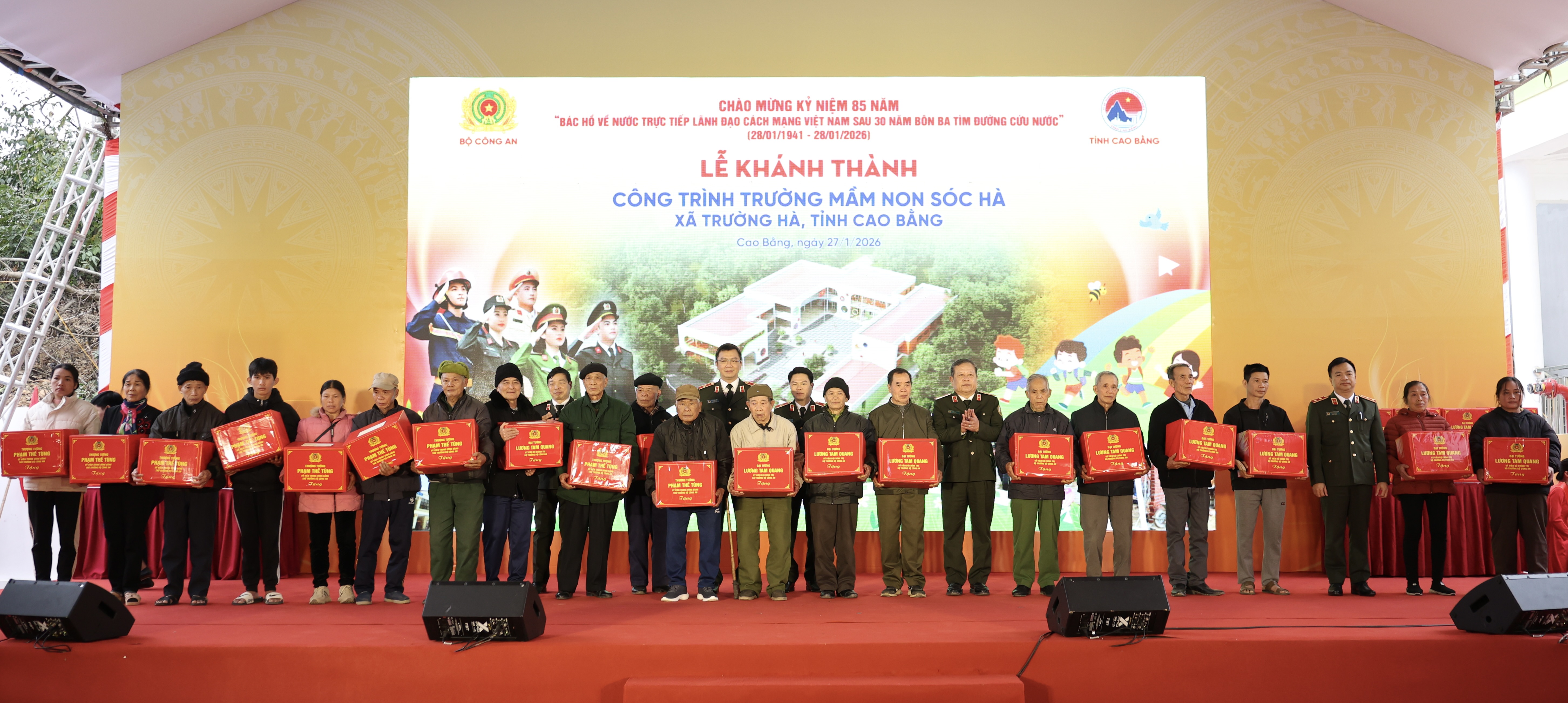 Nhân dịp này, Bộ Công an và Tập đoàn Đèo Cả trao tặng 1.000 suất quà tết cho học sinh và nhân dân xã Trường Hà; lãnh đạo Bộ Công an và Tỉnh ủy trao 10 suất quà cho các tập thể thi công xuất sắc, 20 suất quà cho các hộ gia đình chính sách; đồng thời trao tặng sách, cặp sách và đồ dùng học tập cho 20 học sinh trên địa bàn xã.