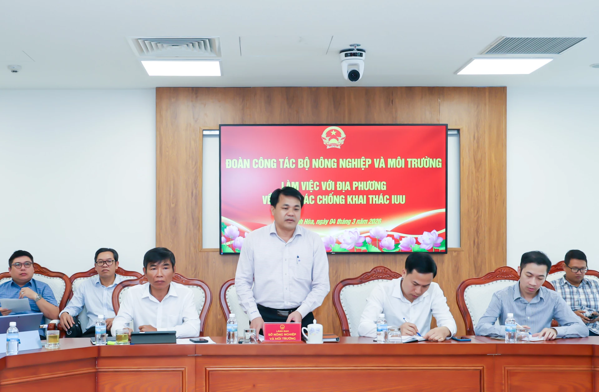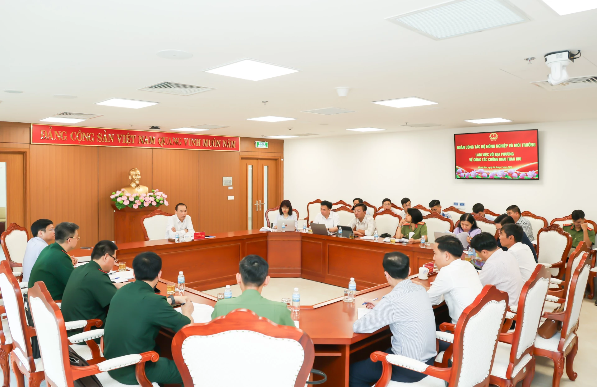 Sáng 4-3, đoàn công tác do Thứ trưởng Bộ Nông nghiệp và Môi trường Phùng Đức Tiến làm Trưởng đoàn làm việc với tỉnh Khánh Hòa về chống khai thác hải sản bất hợp pháp, không báo cáo và không theo quy định (IUU). Thừa ủy quyền của UBND tỉnh, lãnh đạo các sở ngành, đơn vị, địa phương liên quan làm việc với đoàn.