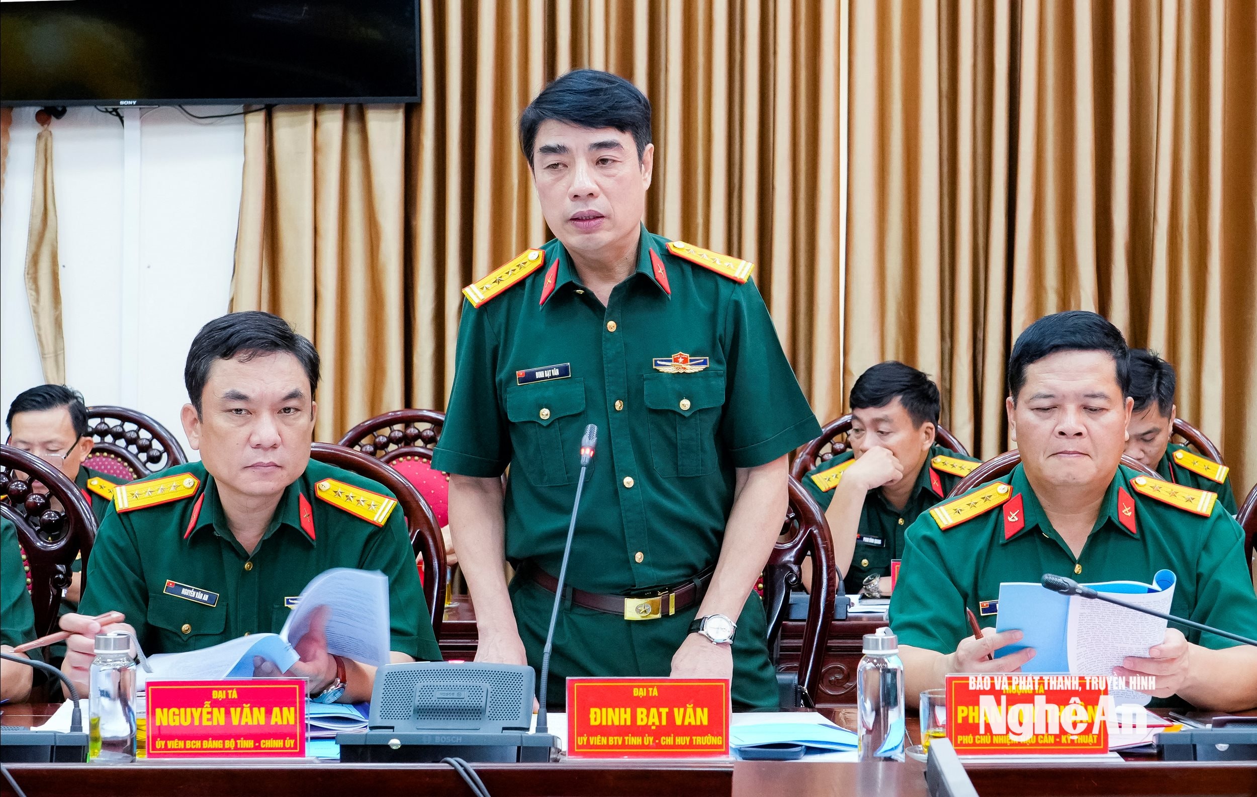 Đại tá Đinh Bạt Văn - Chỉ huy trưởng Bộ Chỉ huy Quân sự tỉnh Nghệ An phát biểu tại buổi làm việc. Ảnh: Phạm Bằng