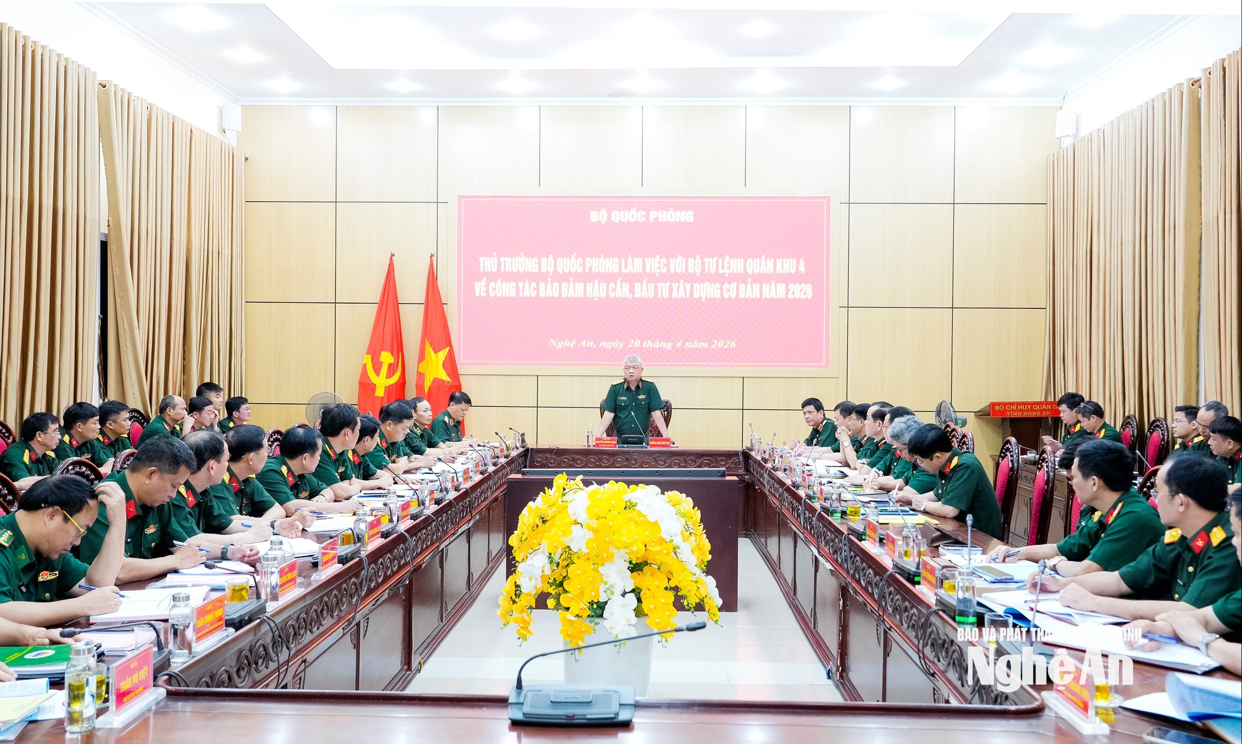 Phát biểu kết luận buổi làm việc, Thượng tướng Nguyễn Quang Ngọc - Thứ trưởng Bộ Quốc phòng biểu dương những kết quả mà Quân khu 4 nói chung và Bộ Chỉ huy Quân sự 2 tỉnh Nghệ An, Hà Tĩnh đã đạt được trong thời gian qua trong công tác đảm bảo hậu cần, đầu tư xây dựng cơ bản năm 2026.