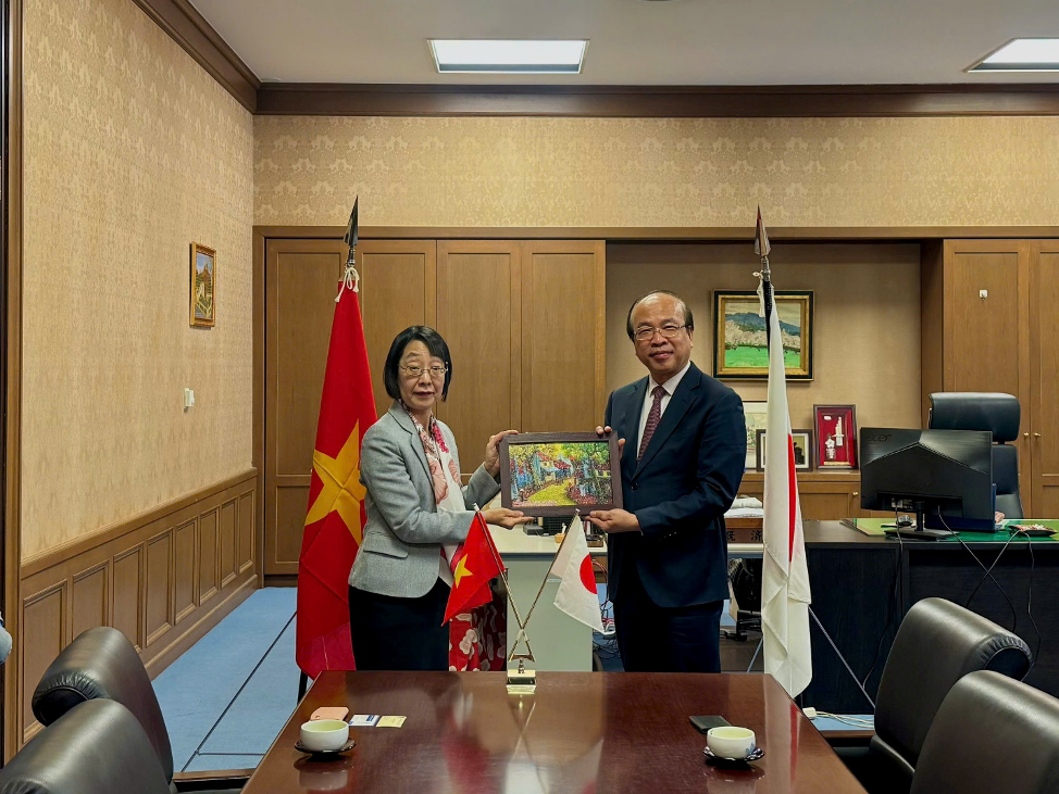 Thứ trưởng Phan Chí Hiếu trao quà lưu niệm của Đoàn đến Bà Viện trưởng MORIMOTO Kana