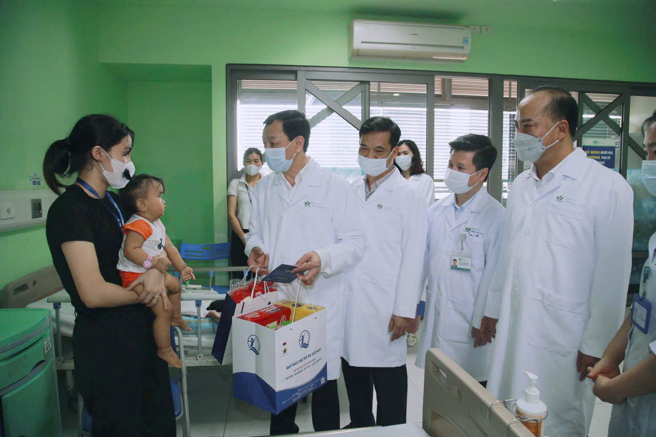 Thứ trưởng Nguyễn Tri Thức (áo trắng gần bố bệnh nhi) tặng quà, động viên sức khỏe bệnh nhi đang điều trị tại Bệnh viện Nhi Trung ương.