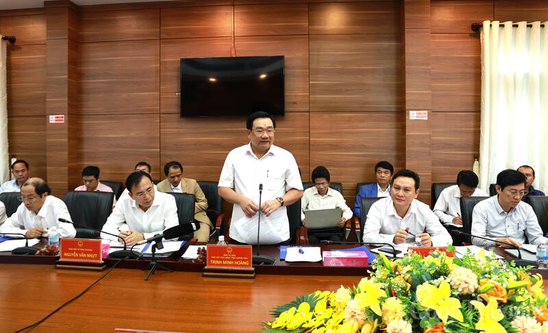 Phó Chủ tịch UBND tỉnh Trịnh Minh Hoàng báo cáo trước đoàn công tác của Thứ trưởng Nguyễn Hoàng Long. Ảnh: Minh An