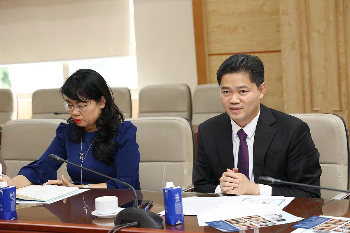 Ủy viên Dự khuyết Trung ương Đảng, Thứ trưởng Thường trực Bộ Y tế Vũ Mạnh Hà trò chuyện với bà Katrin Kandel.