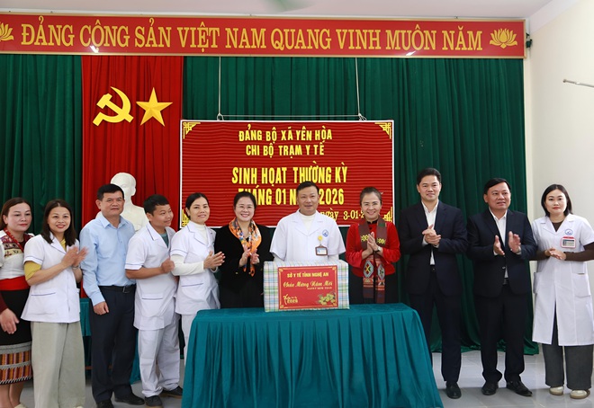 Thứ trưởng Thường trực Bộ Y tế Vũ Mạnh Hà và Giám đốc Sở Y tế Nghệ An Lê Thị Hoài Chung tặng quà cho Trạm y tế xã Yên Hòa.