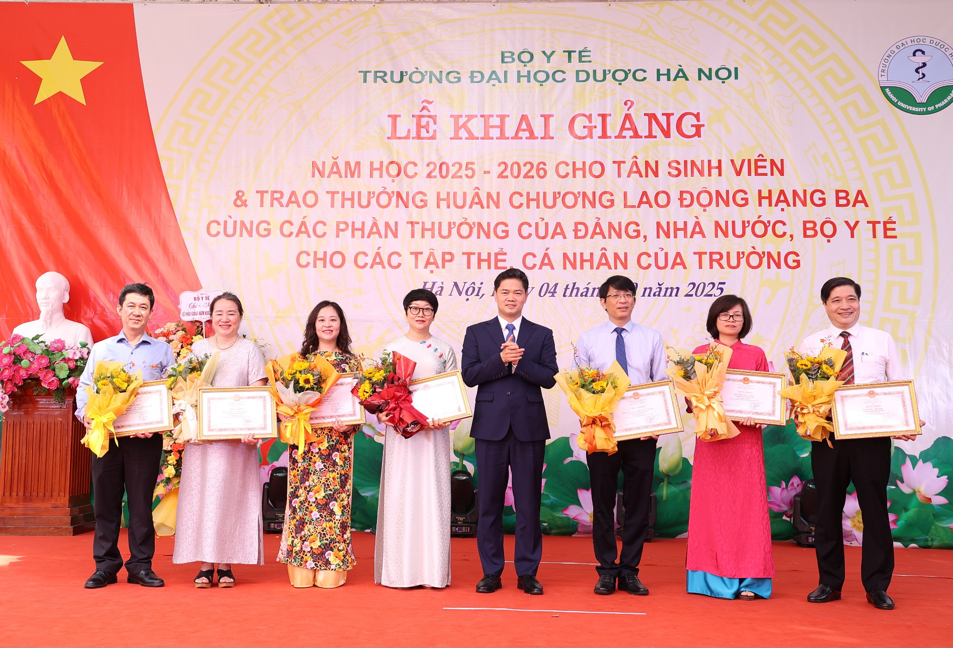 Thứ trưởng Thường trực Bộ Y tế Vũ Mạnh Hà thừa ủy quyền của Bộ trưởng Bộ Y tế trao Bằng khen của Bộ trưởng Bộ Y tế tặng 7 tập thể, 5 cá nhân là những cán bộ, giảng viên của trường Đại học Dược Hà Nội có thành tích xuất sắc trong công tác đào tạo, nghiên cứu khoa học.