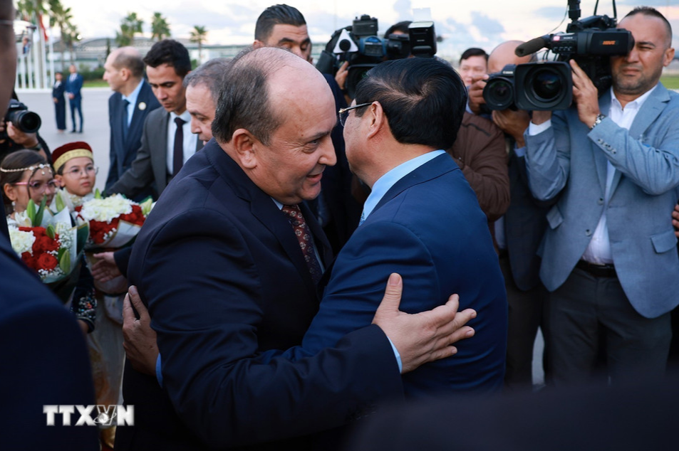 Các quan chức cấp cao Algeria và cộng đồng người Việt tại Algeria chào đón Thủ tướng Phạm Minh Chính và Phu nhân. Ảnh: TTXVN