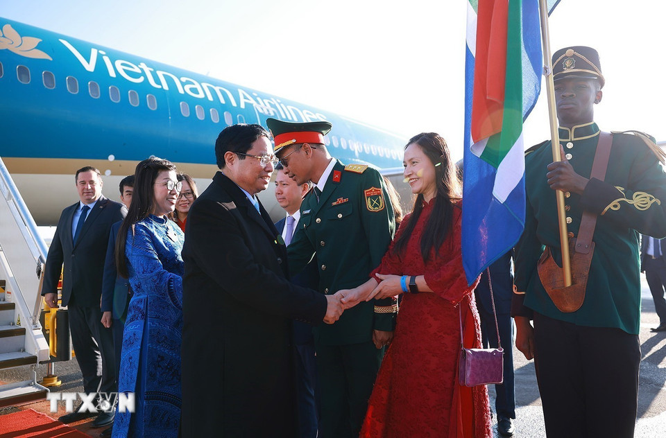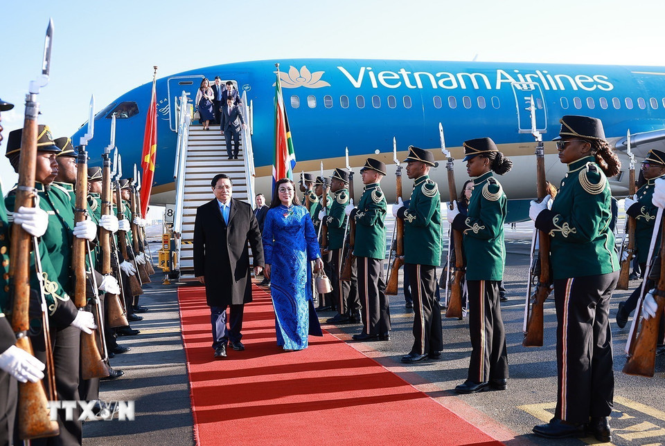 Lễ đón Thủ tướng Phạm Minh Chính và Phu nhân bắt đầu chuyến tham dự Hội nghị Thượng đỉnh G20 tại Nam Phi. (Ảnh: Dương Giang/TTXVN)
