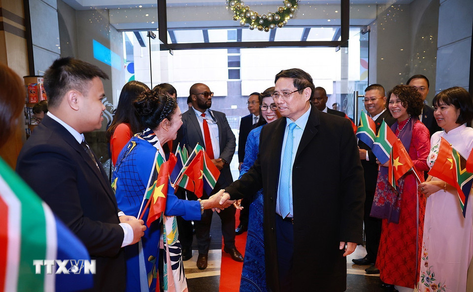 Cán bộ, nhân viên Đại sứ quán và cộng đồng người Việt Nam tại Nam Phi đón Thủ tướng Phạm Minh Chính và Phu nhân. (Ảnh: Dương Giang/TTXVN)