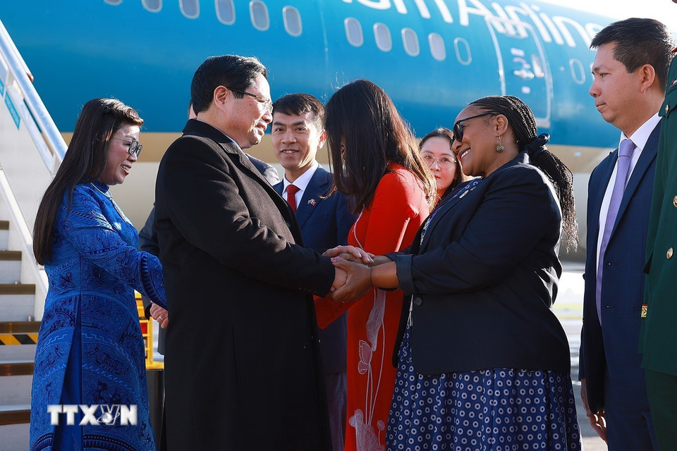 Lễ đón Thủ tướng Phạm Minh Chính và Phu nhân tại sân bay O.R. Tambo, Johannesburg, Nam Phi. (Ảnh: Dương Giang/TTXVN)