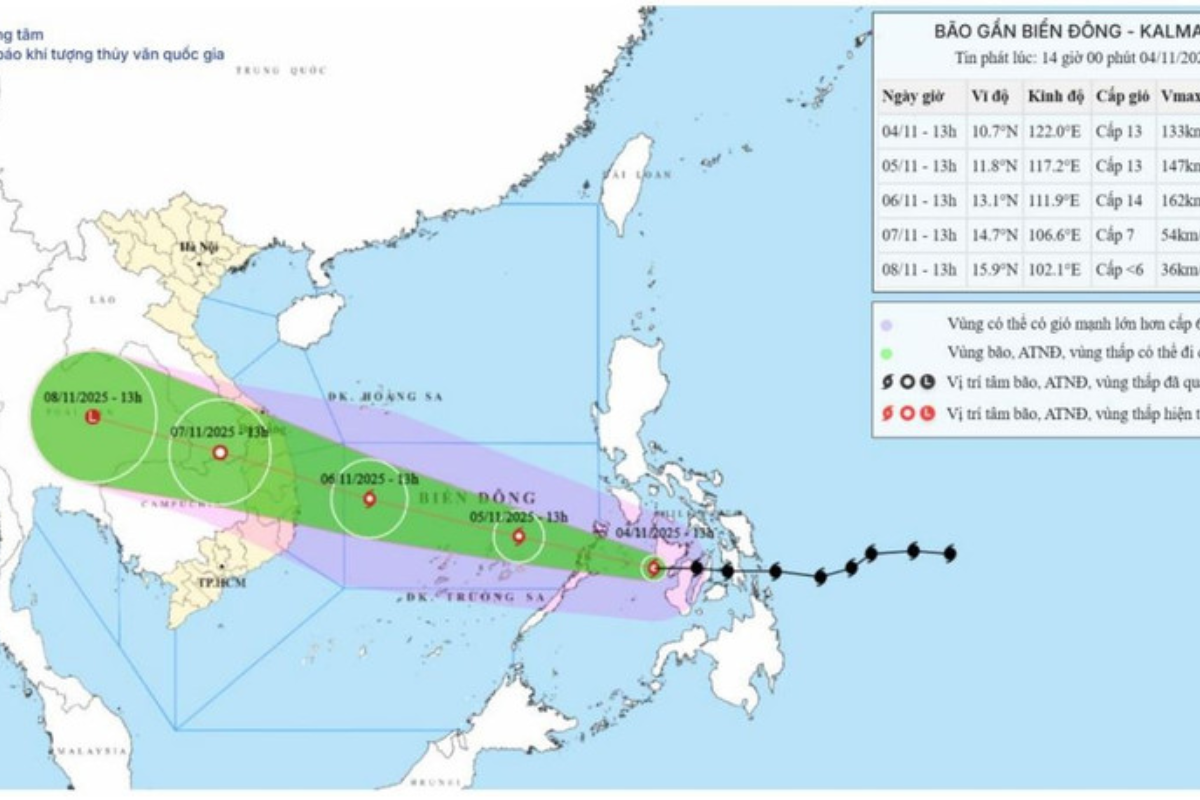 Bản đồ dự báo quỹ đạo và cường độ bão Kalmaegi phát lúc 14 giờ chiều 4/11/2025.