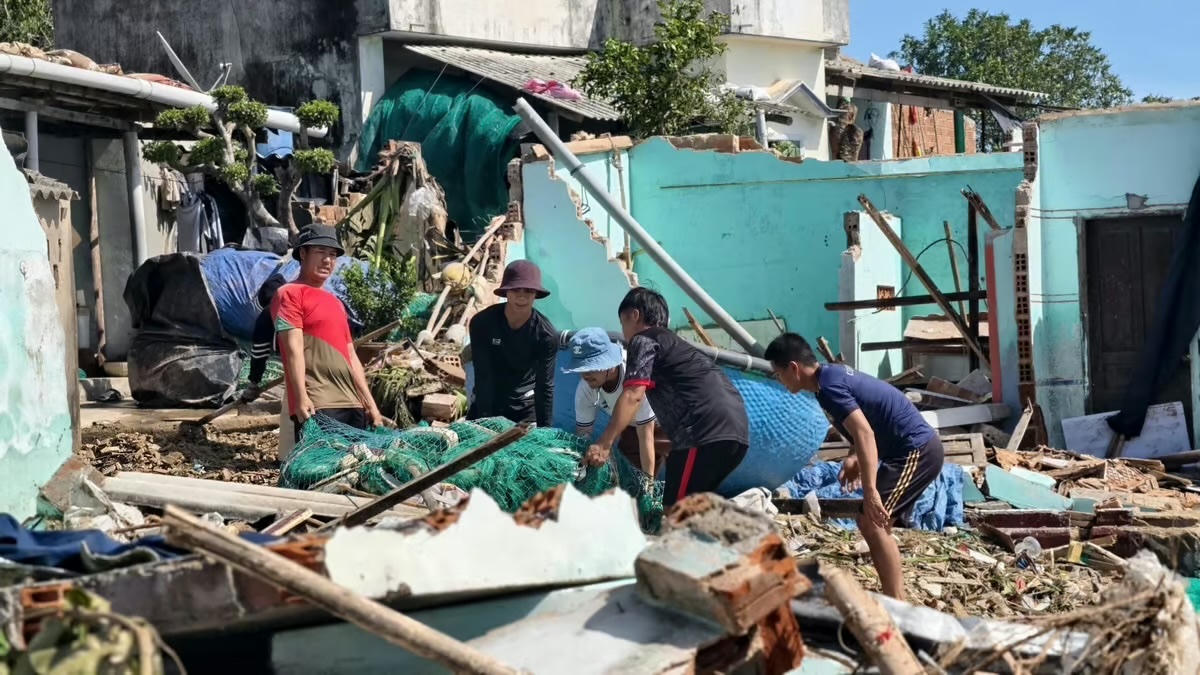 Lực lượng chức năng và người dân làng chài Xuân Thạnh, xã Phù Mỹ Đông, Gia Lai dọn dẹp đống hoang tàn sau bão. Ảnh Đình Sang