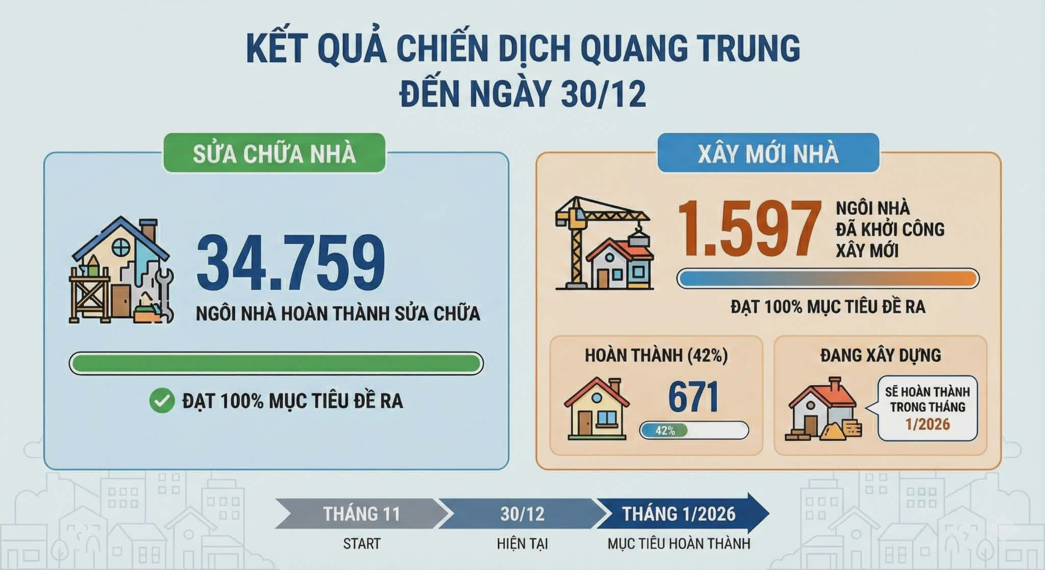 Sau hơn 1 tháng phát động "Chiến dịch Quang Trung", đến ngày 30/12, tại các tỉnh hoàn thành sửa chữa 34.759 ngôi nhà (đạt 100% mục tiêu đề ra). Cùng đó, các đơn vị đã khởi công xây mới 1.597 ngôi nhà (đạt 100%), trong đó đã hoàn thành 671 nhà (đạt 42%), số nhà đang xây sẽ được hoàn thành trong tháng 1/2026.