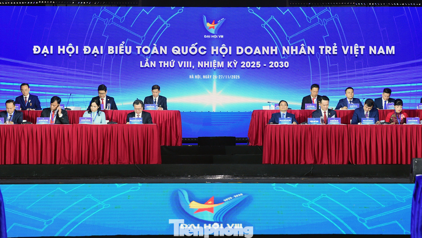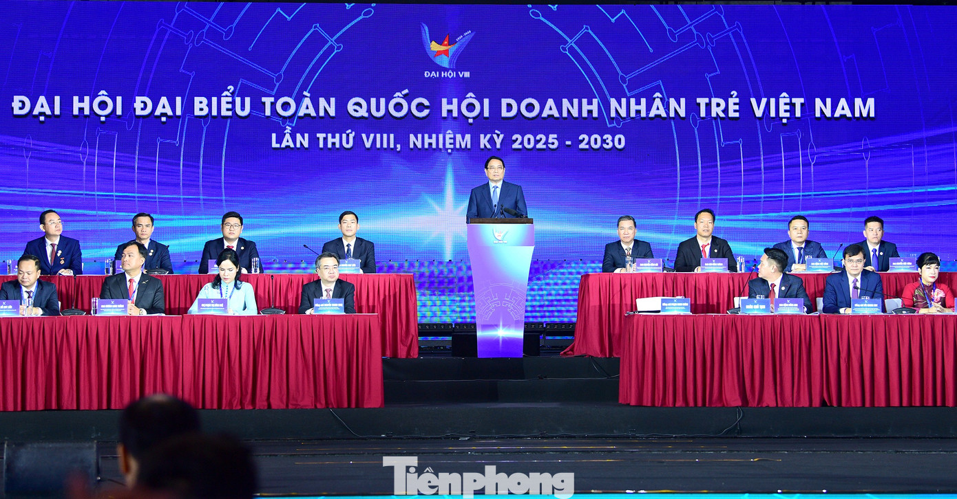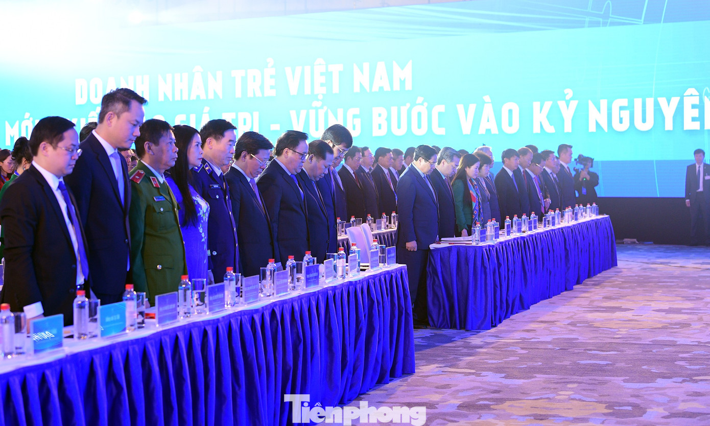 Thủ tướng Phạm Minh Chính và Đoàn Chủ tịch điều hành Đại hội đại biểu toàn quốc Hội Doanh nhân trẻ Việt Nam lần thứ VIII. Ảnh: Xuân Tùng